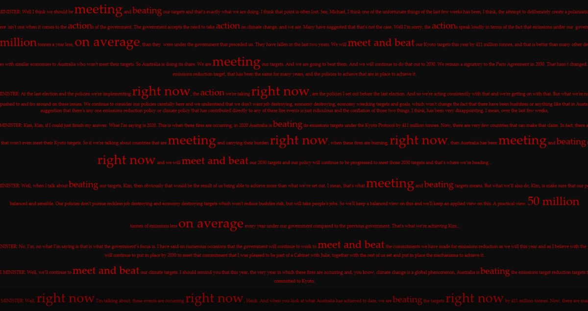 Today, Scott Morrison is being interviewed by the Australian Broadcasting Corporation. He is very likely to use phrases like ‘right now‘ and ‘meet and beat‘ and ‘in 2020, this year, we will…‘. They are designed to imply that Australia is already doing what so many are crying out for: quickly acting to reduce emissions, and leading other countries in their efforts to do the same.