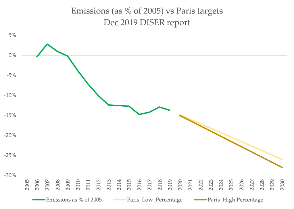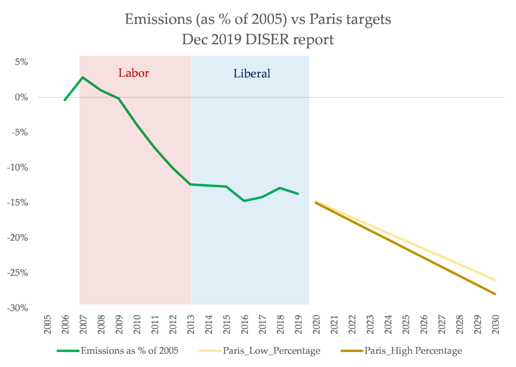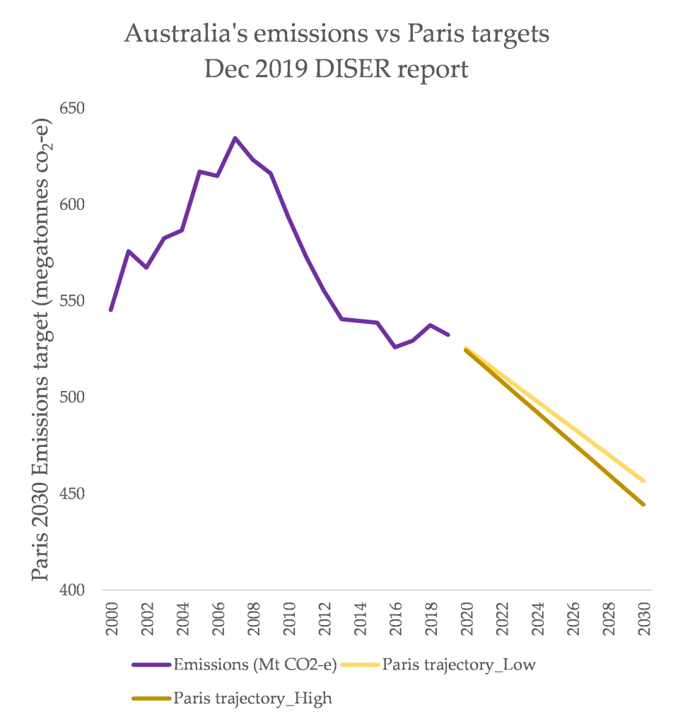 Well, let’s have a look at Australia’s historical emissions, and what emissions will have to do to get to the Paris targets (between 26% to 28% of 2005 levels, by the year 2030):