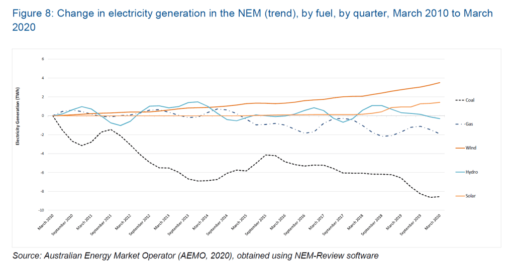 A few days ago, Taylor’s latest attempt to couple fossil fuels with renewables ended up showing that gas is not required, when you click on the report he used. And, beautifully, even this report shows that as wind and solar increase in output in Australia, gas has been decreasing: