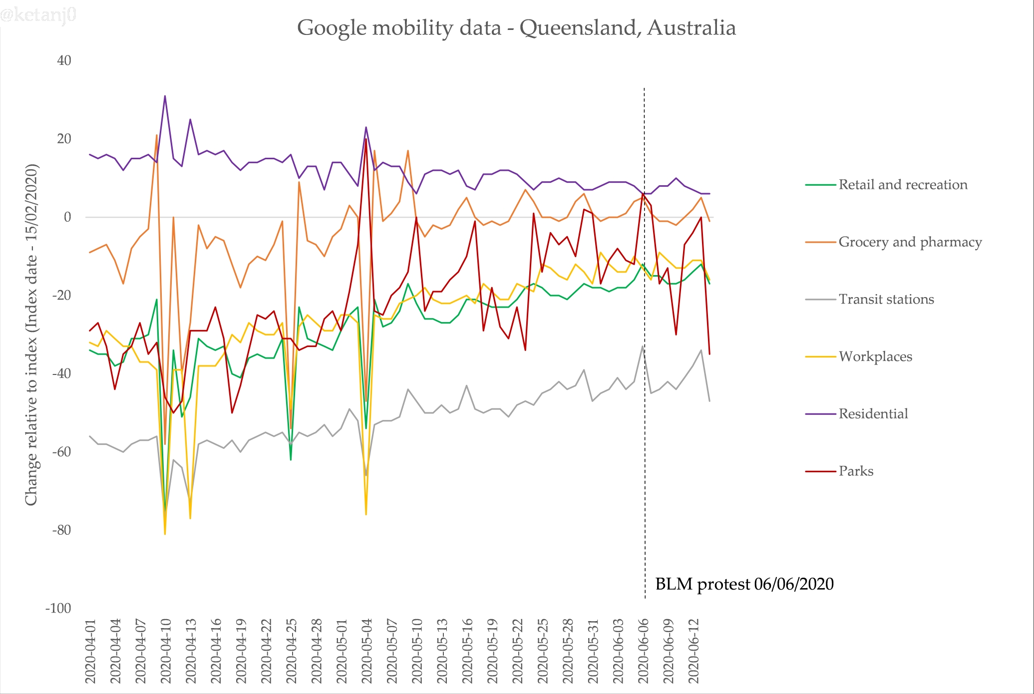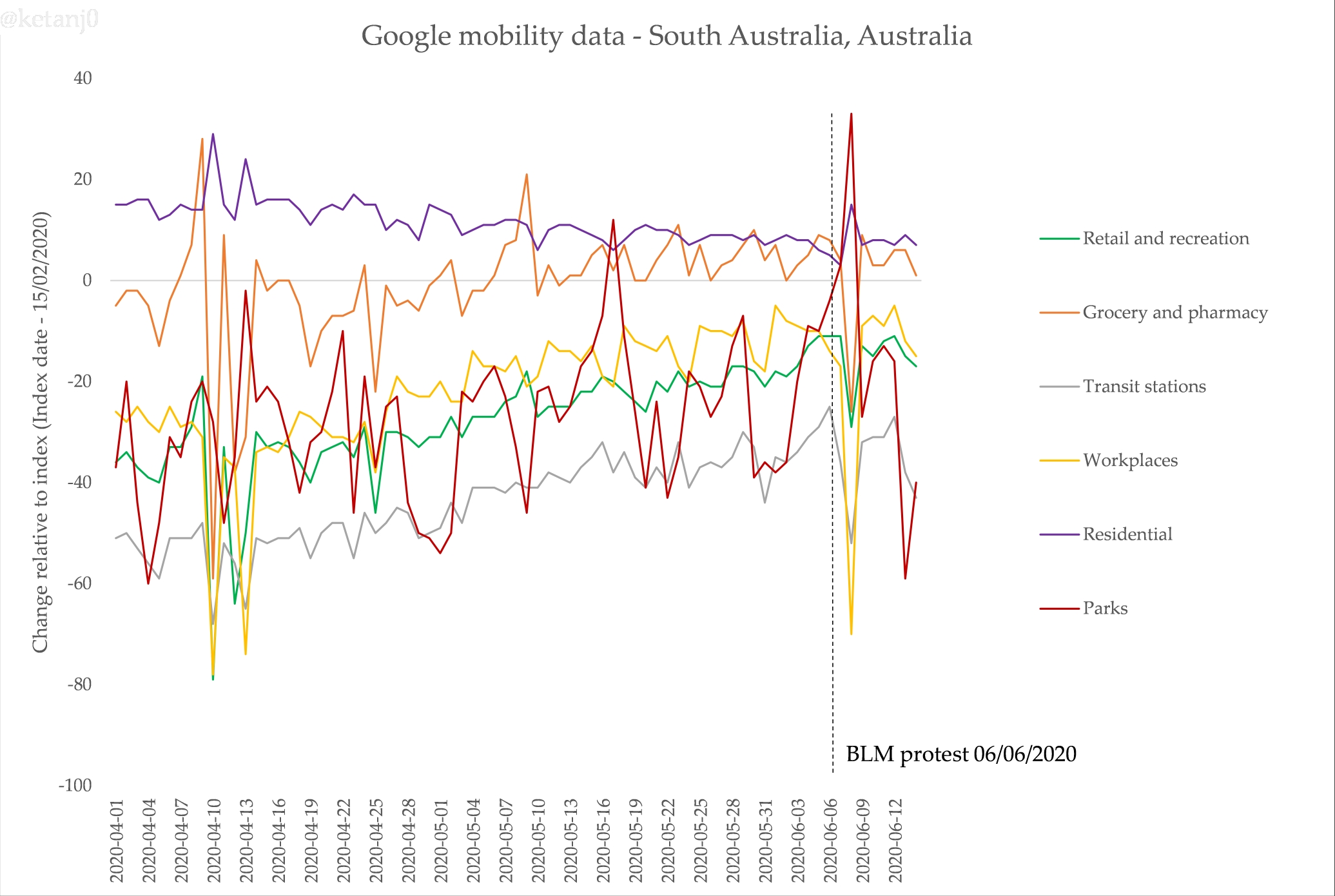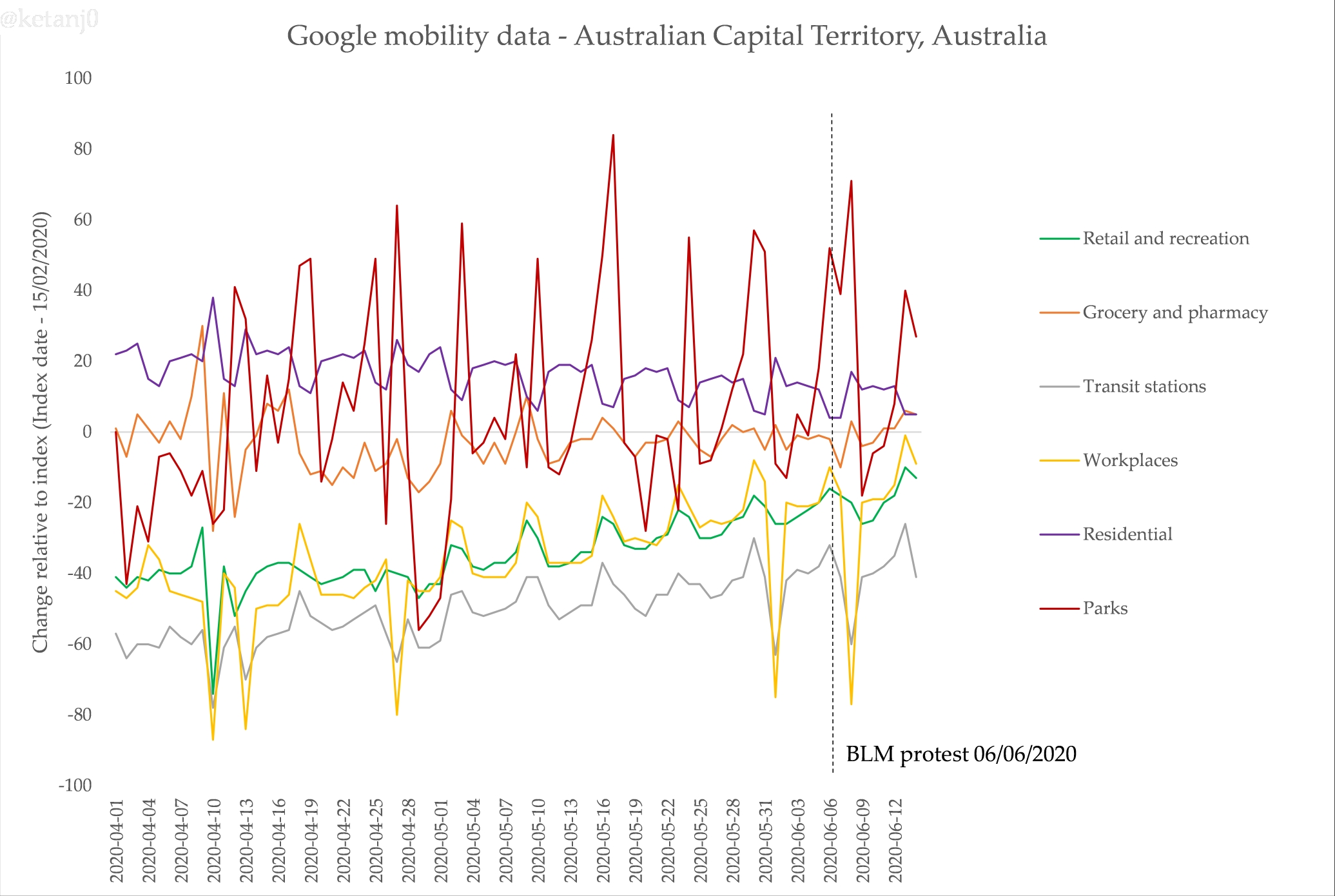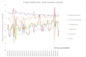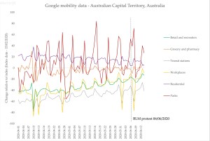 First, Google makes mobility data they’ve collated from their location data that’s on by default for many Android phones (a problematic thing, for sure). Here’s Victoria’s data, including the impact of the protest on the data for ‘parks’ – unfortunately it only goes up to June 17, but I will update this post on the 24th, when the next update is released: