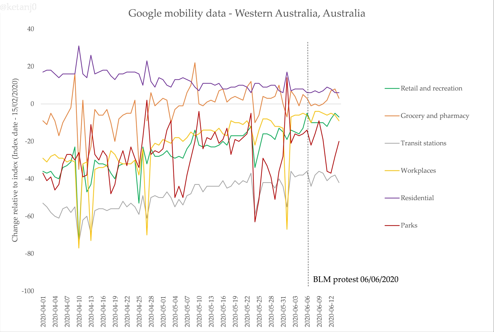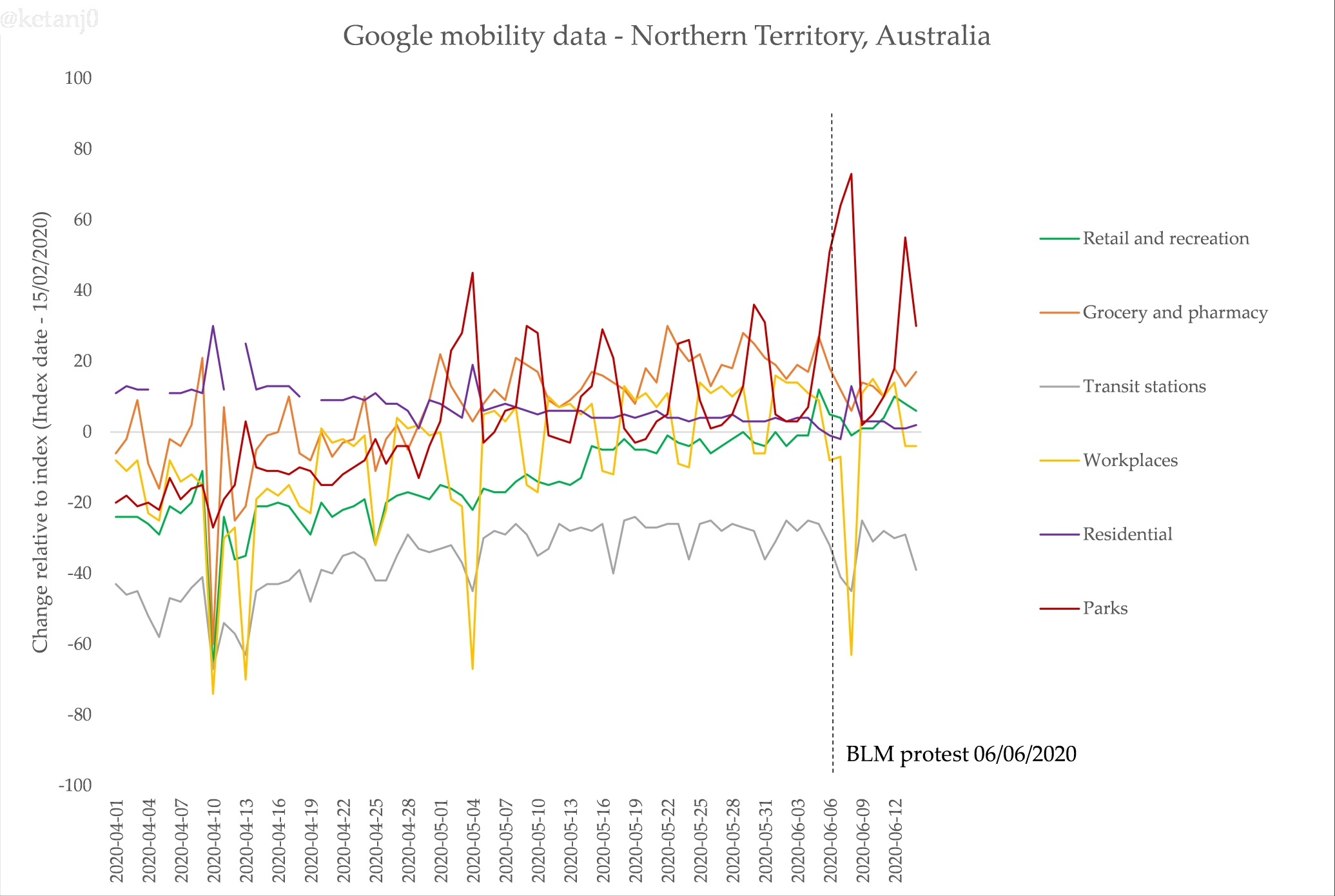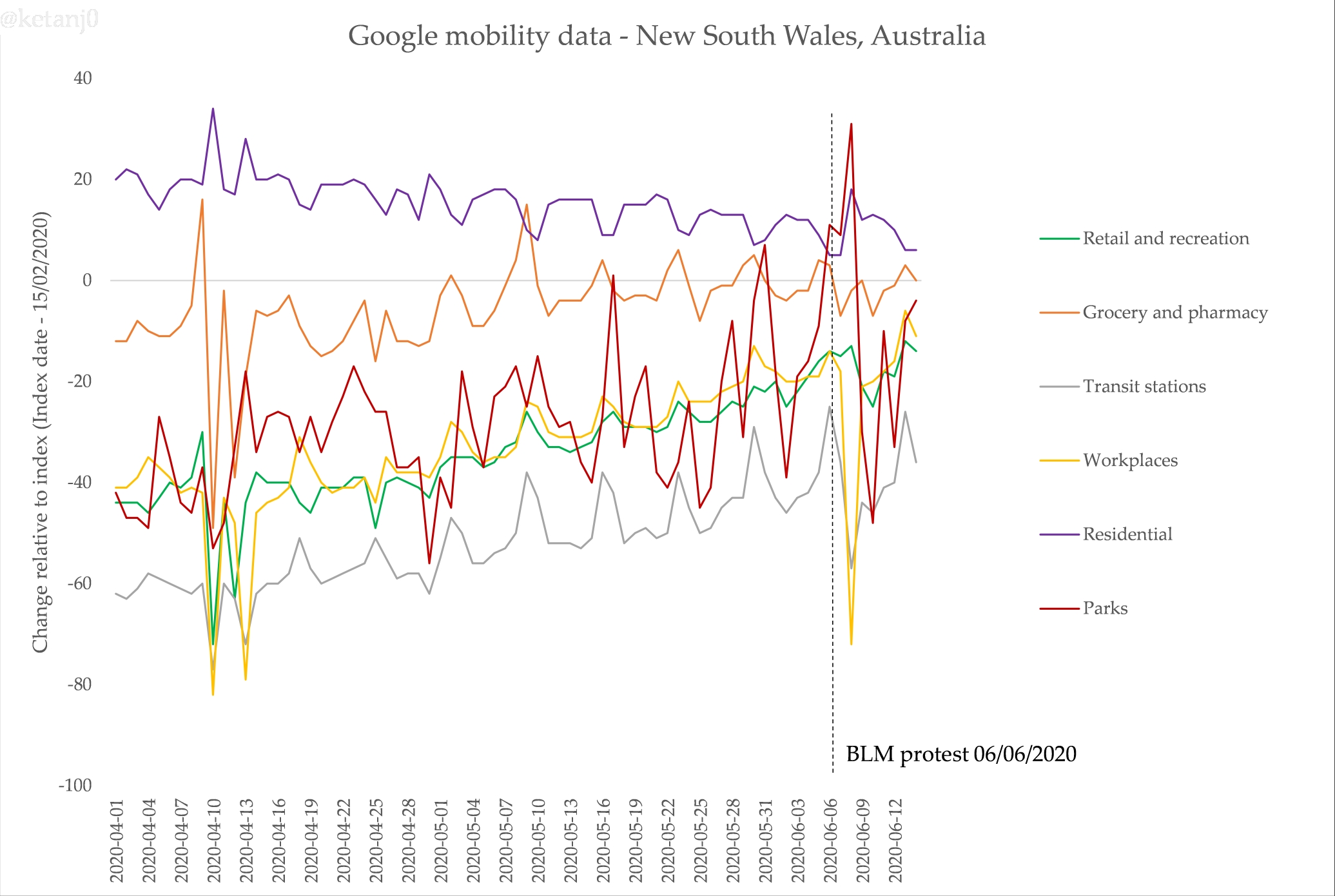 First, Google makes mobility data they’ve collated from their location data that’s on by default for many Android phones (a problematic thing, for sure). Here’s Victoria’s data, including the impact of the protest on the data for ‘parks’ – unfortunately it only goes up to June 17, but I will update this post on the 24th, when the next update is released: