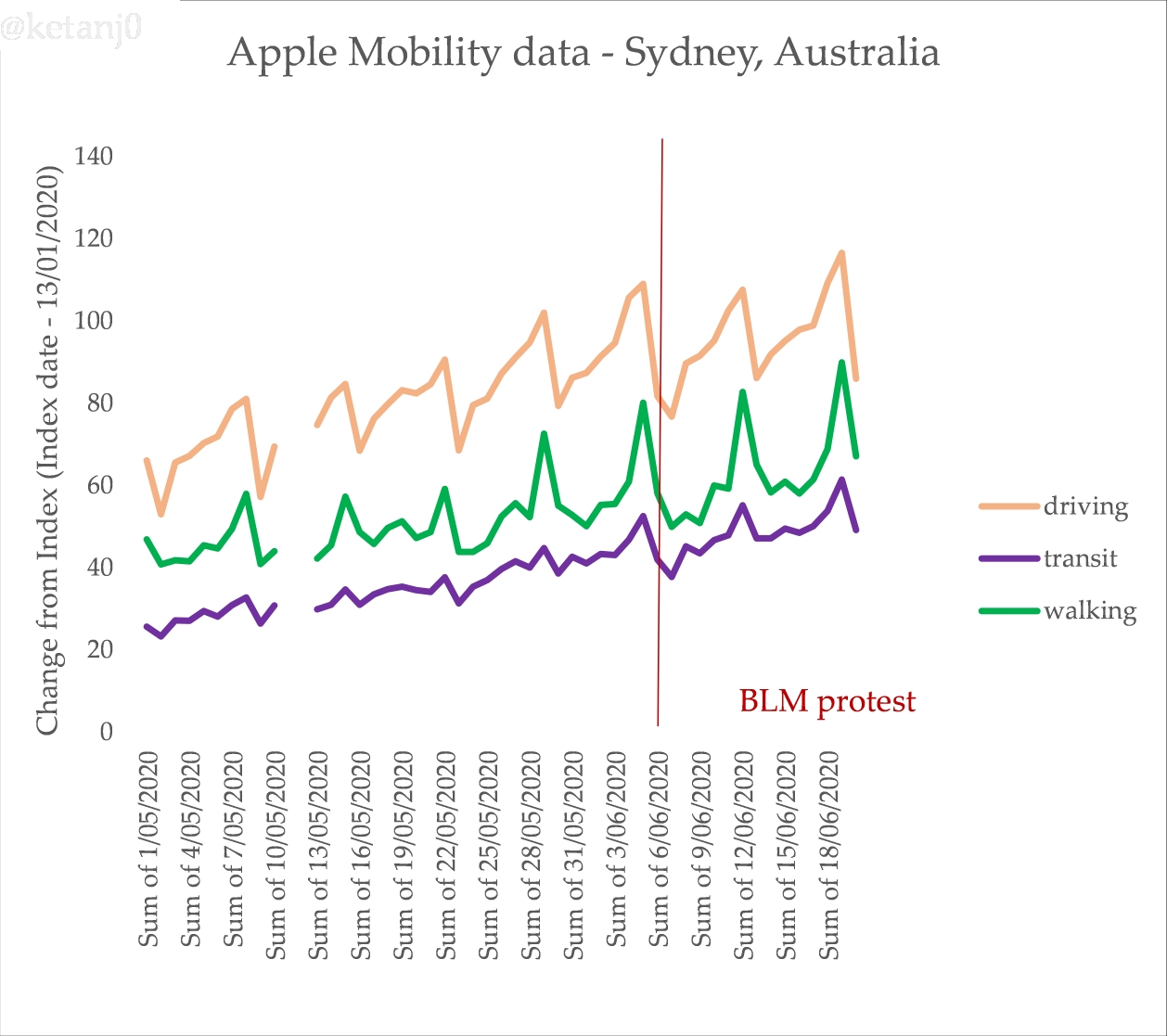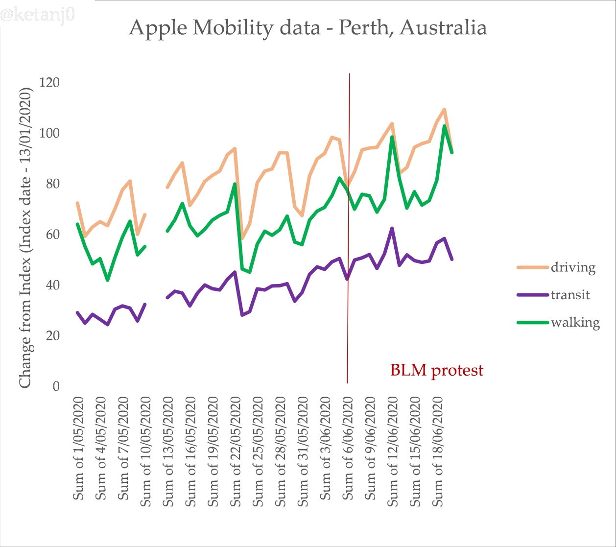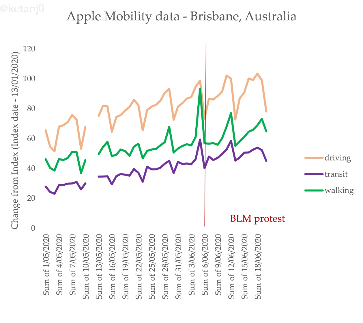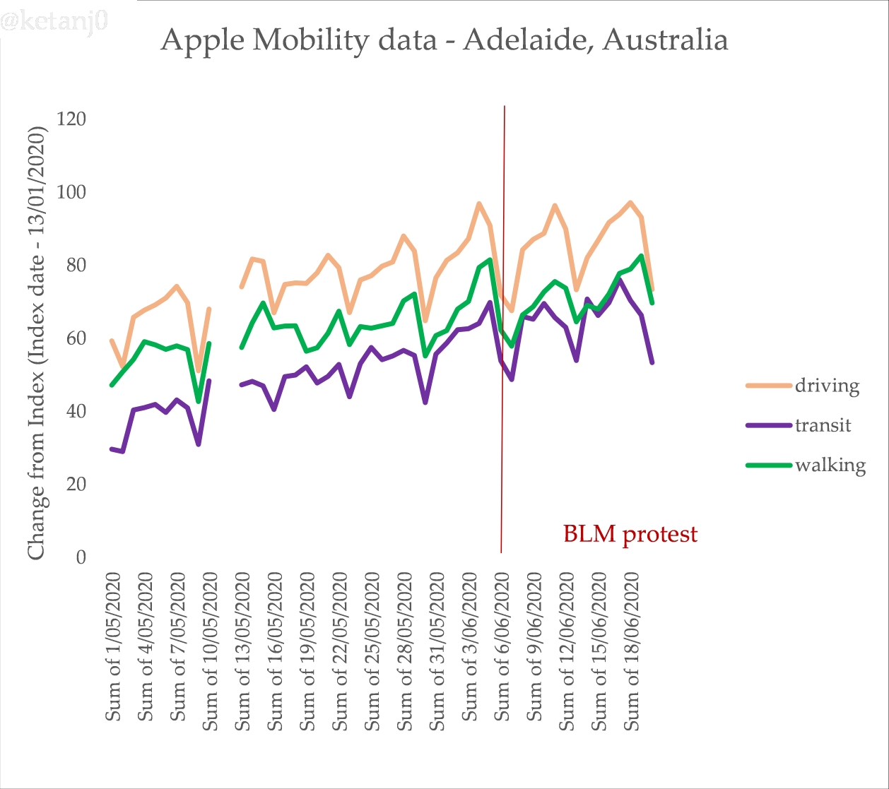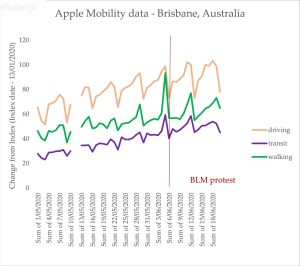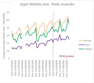 Australia has been going through a long, slow process of increased human movement since the commencement of the COVID19 lockdowns. This isn’t unusual. We can confirm this pattern using Apple’s mobility data too, which is slightly less problematic because it uses directions requests in phones rather than tracking, but that also makes it slightly less granular (hence why you don’t see a bump for walking for the protests). For Melbourne: