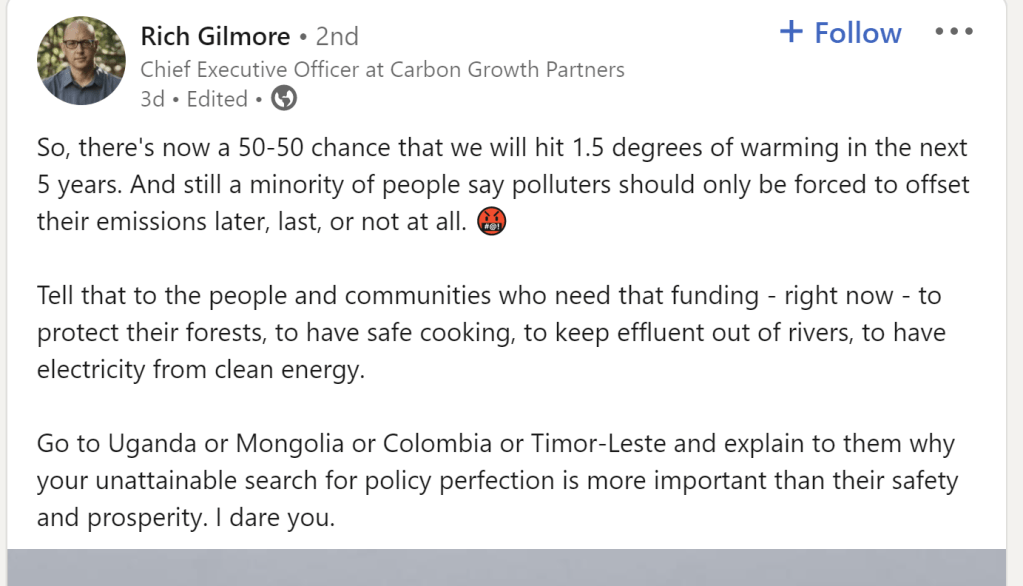 “So, there’s now a 50-50 chance that we will hit 1.5 degrees of warming in the next 5 years. And still a minority of people say polluters should only be forced to offset their emissions later, last, or not at all. ๐Ÿคฌ Tell that to the people and communities who need that funding – right now – to protect their forests, to have safe cooking, to keep effluent out of rivers, to have electricity from clean energy. Go to Uganda or Mongolia or Colombia or Timor-Leste and explain to them why your unattainable search for policy perfection is more important than their safety and prosperity. I dare you”