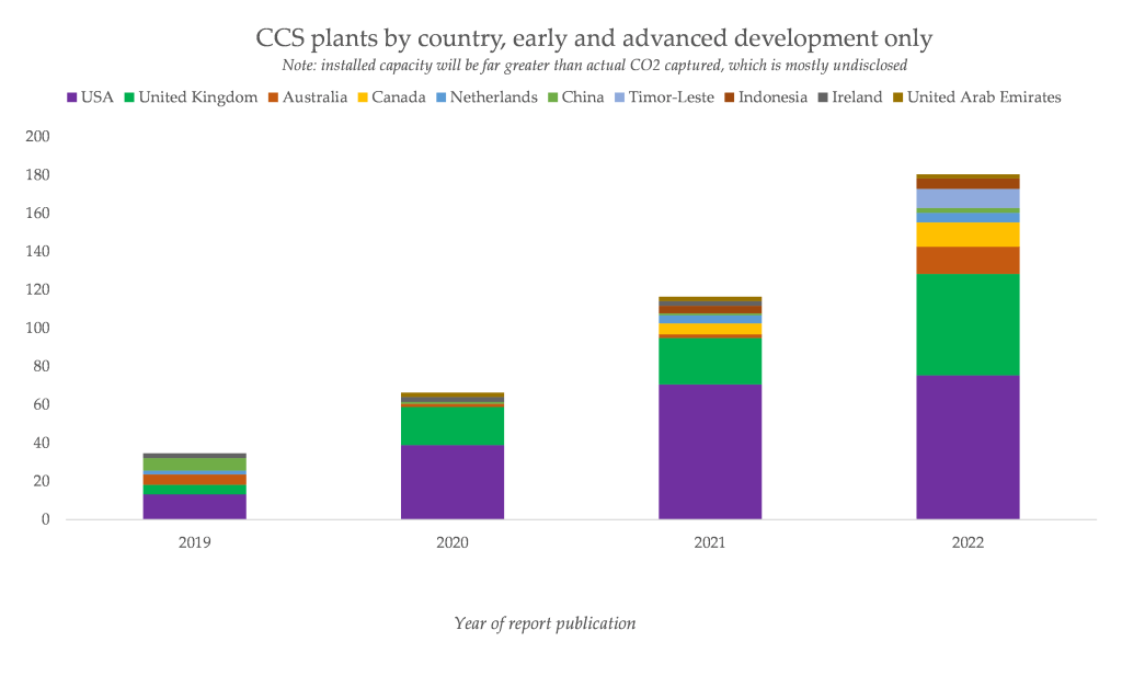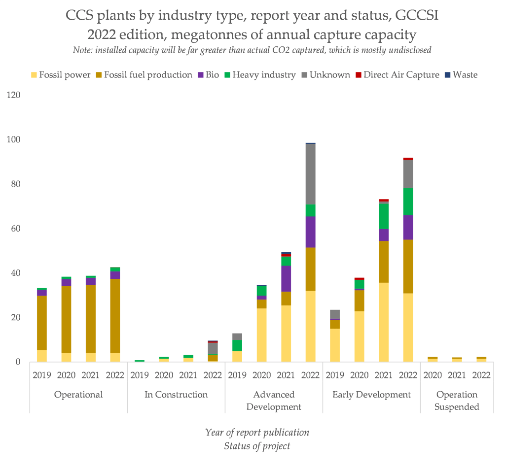 For these new projects, they are comprised mainly of CCS used to shave a sliver of emissions off expanding fossil fuel extraction and combustion. A repeat of the fossil fuel expansionism that CCS enabled previously. There are some industrial and bioenergy projects here, but most are inherently linked to the fossil fuel industry.