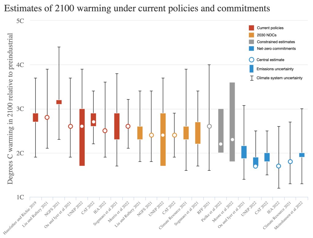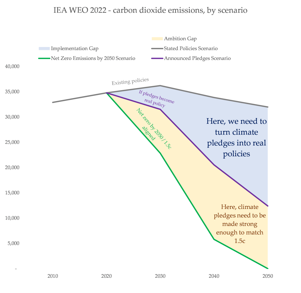Below, I show the IEA’s various World Energy Outlook scenarios – namely, a projection of existing policies, what happens if climate pledges are turned into policies, and the 1.5c compatible scenario. The gaps between the two lines demonstrate two key challenges: how we translate climate pledges (like, ‘net zero targets’) into policies that cause real change, and how we set climate pledges so they’re at least vaguely sufficient.