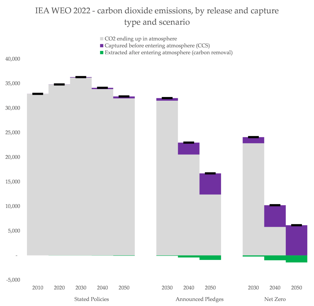 That is a steep blank white space between the green mound and the purple line. The IEA isn’t ignorant of it. “If all of these projects proceed to operation, around 260 Mt CO2 would be captured in 2030. This represents a sixfold increase on current deployment yet only around 20% of what is required in the NZE Scenario”, they write in the 2022 world energy outlook.
