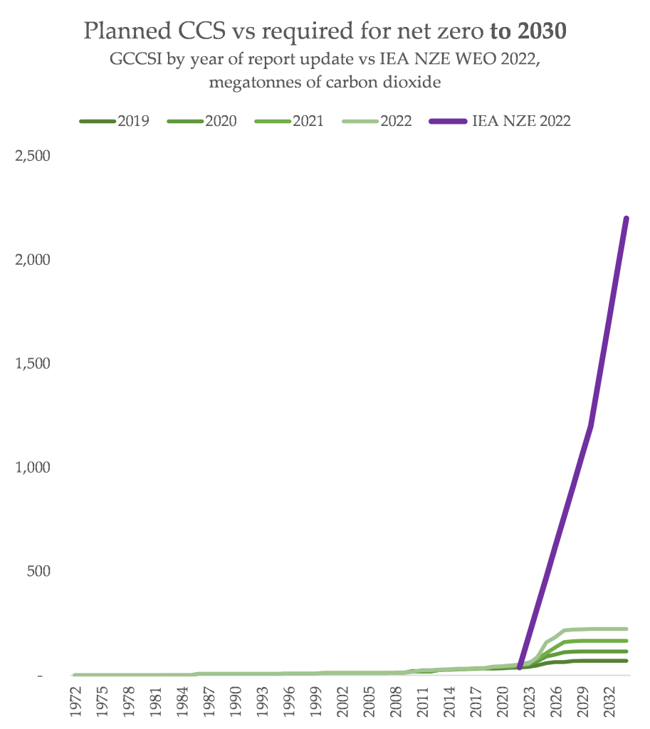 Another way of visualising this is looking at how the outlook for CCS has changed each year. But the yearly rate at which new projects are being added into the pipeline is nowhere near enough growth to make it likely it’ll end up close to what’s modelled. And that is assuming it all gets built, and operates.