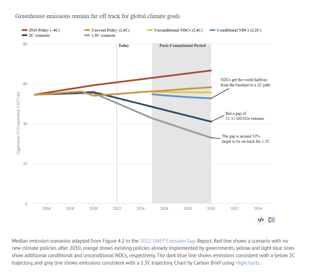 To be clear about this: we’re on the grey line – the worst of these three trajectories. Based on ‘current policies’, we’ll see somewhere between just under 2 to more than 4 degrees of global overheating. Think about everything you’ve seen this year in the headlines, illustrating the impacts of 1.1C of warming. That gives you some idea of how much we do not want to see 2, or 3, or 4 or more.
