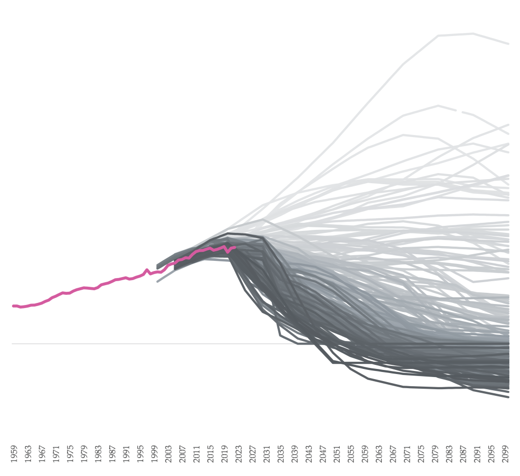 I’ve often seen the exclusion of this thinking defended on the grounds of the improbability or the difficulty of widespread attitudinal and cultural change in society. It’s a fair concern, but when viewed in contrast to the ludicrous technological assumptions in mainstream climate modelling, hardly seems like a reason for omission from the big, official paintings of the spaghetti lines of the future.