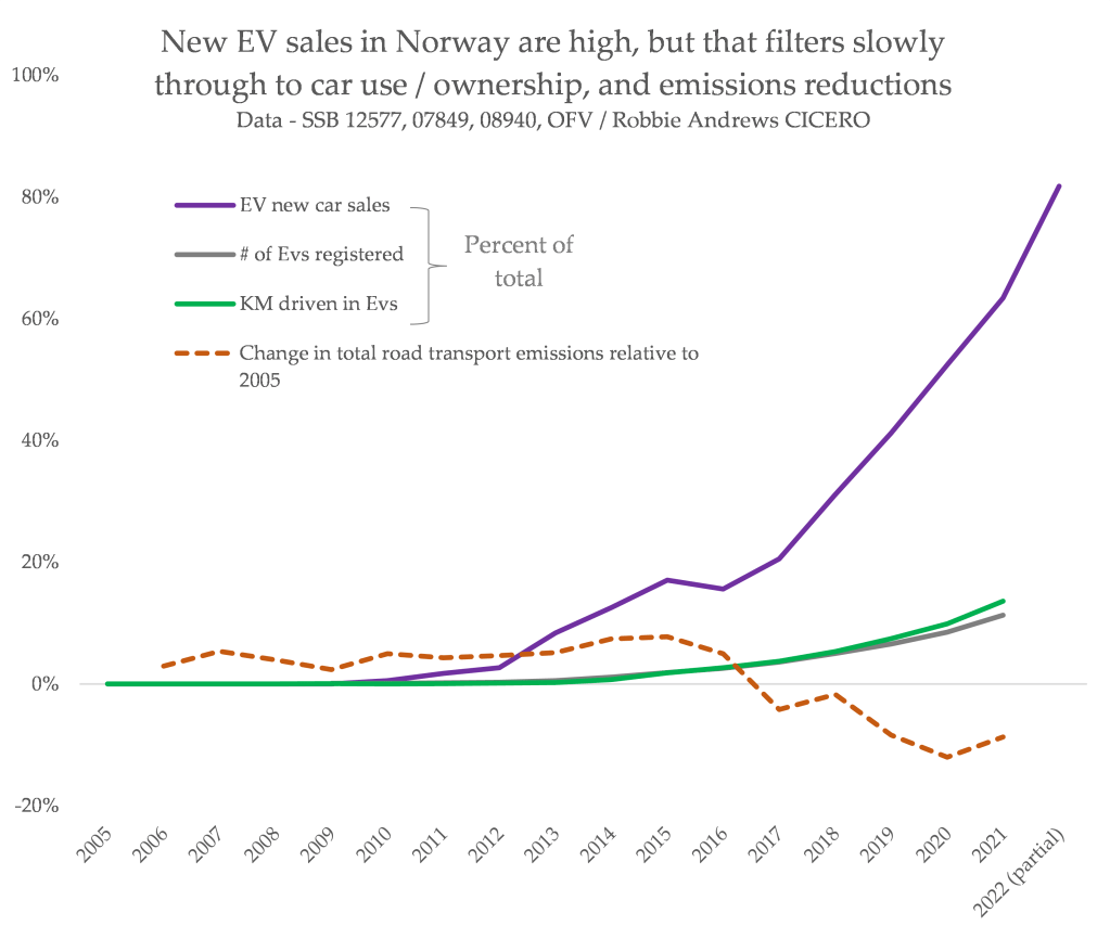 People own cars for a long time. Even with 100% sales of electric vehicles, it can still take decades for the fleet to ditch reliance on oil. I live in Norway, comfortably the highest EV (and Tesla) deployment per capita country in the world, and road transport emissions are falling very slowly here. This is even with heavy government subsidies and support.