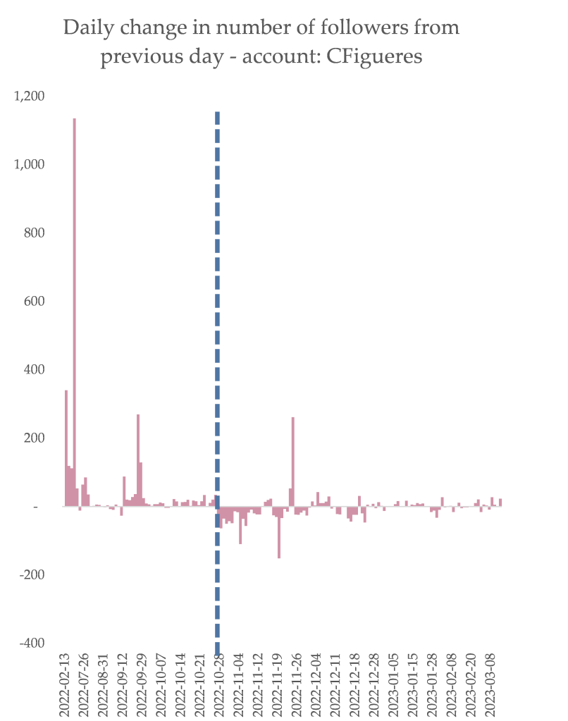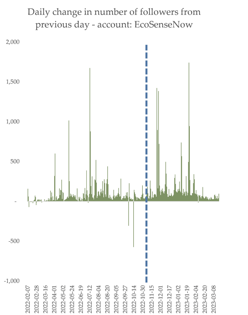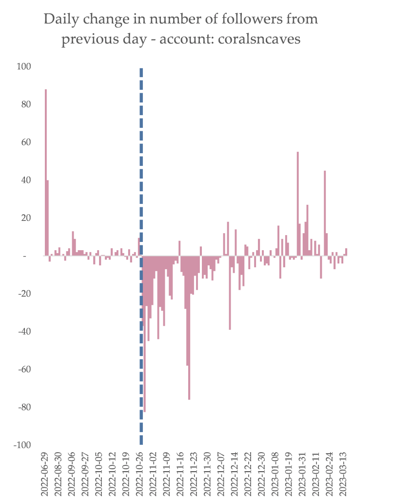 Among the ‘pro’ accounts, circumstances have masked loss. My own account saw a noticeable boost during COP27 last year, which came just after Musk’s purchase, due to a surprisingly viral thread about carbon offsets. But outside of that, I have lost followers both generally and specifically due to having to lock my account regularly to avoid rapidly worsening racist abuse on Musk-Twitter.
