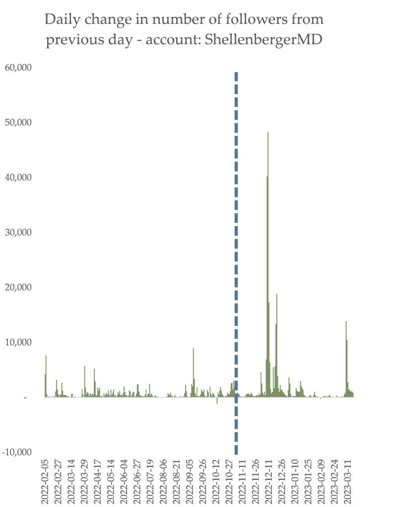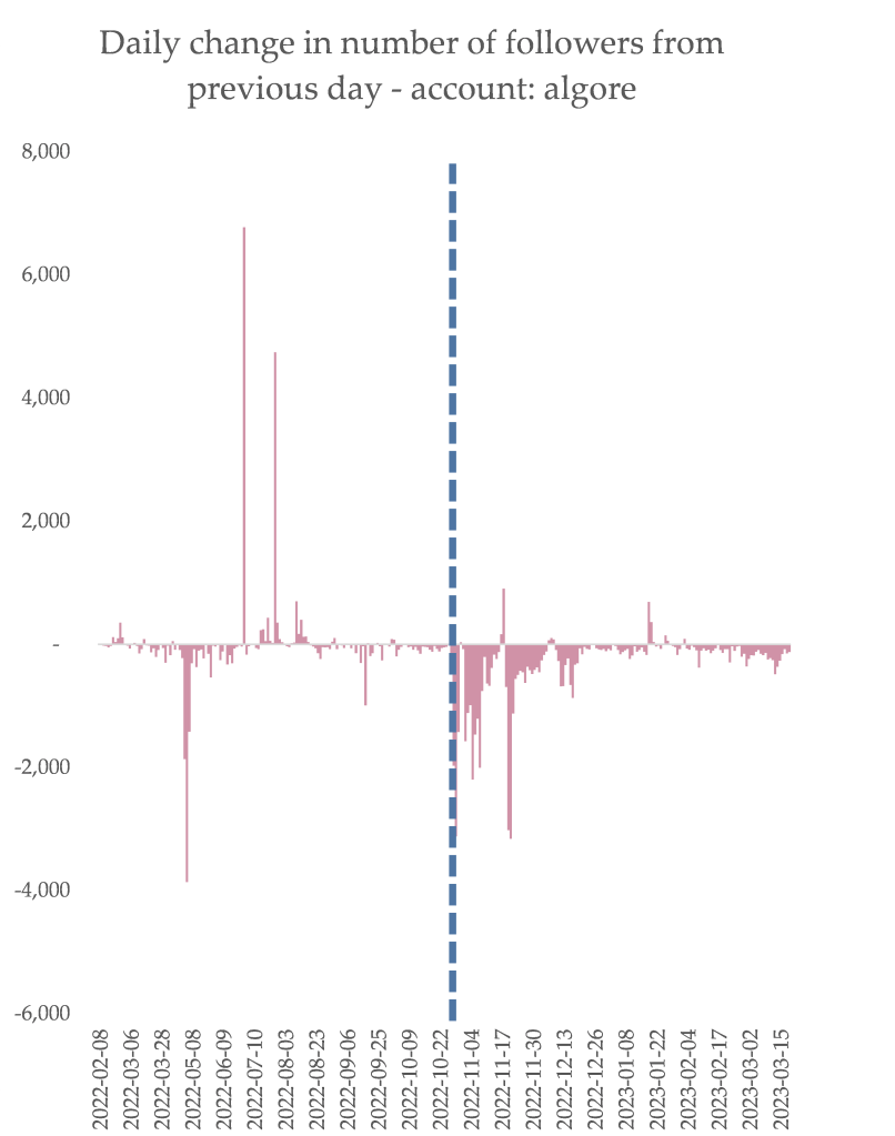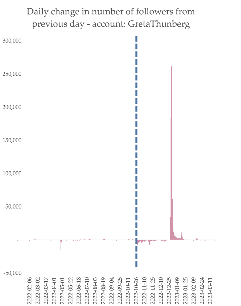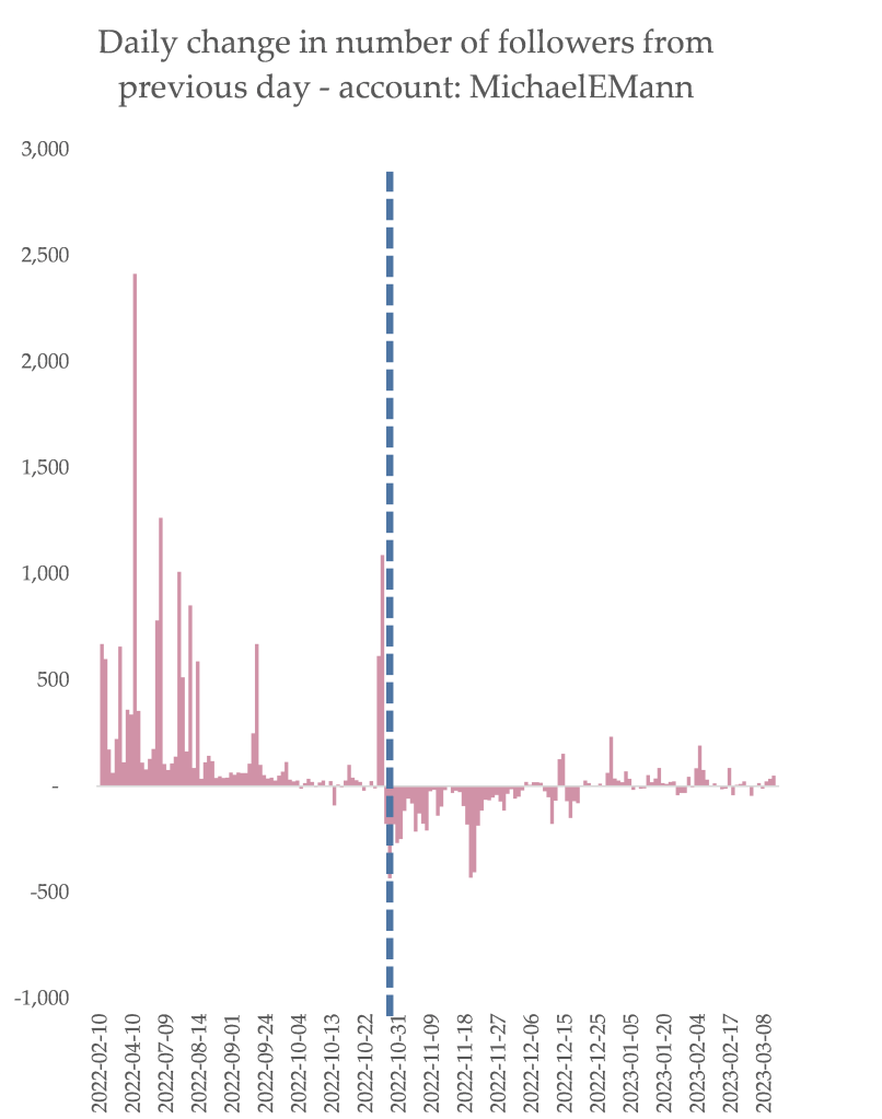 To throw in a few more illustrative accounts, here are daily changes in following for prominent denier accounts, with the date of Musk’s purchase highlighted:
