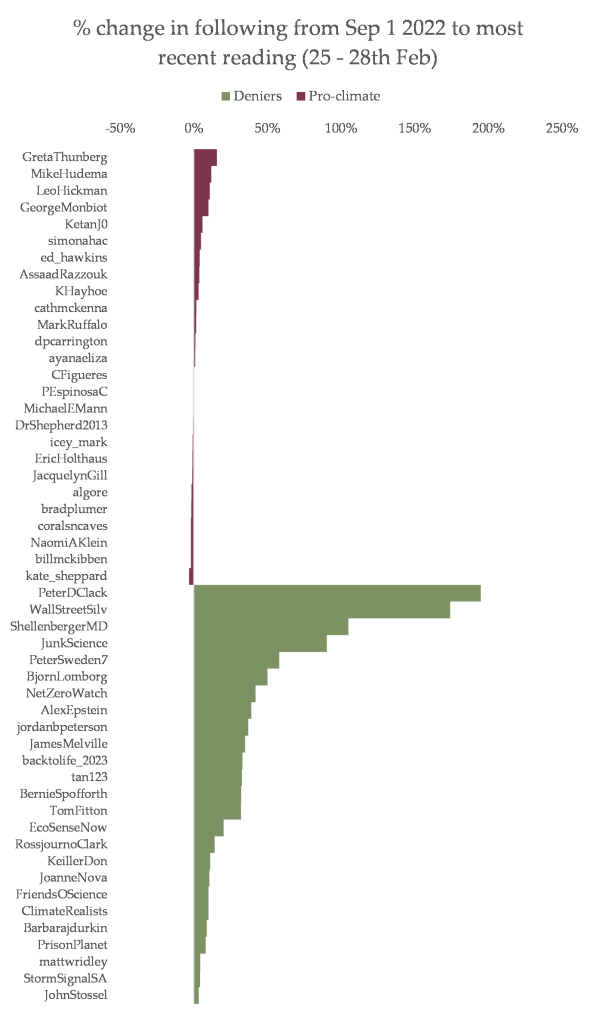 I picked a Sep 2022 baseline because earlier than that has too many gaps, particularly for pro-climate accounts. That’s three full months before Musk’s purchase of Twitter was finalised, on October 31. Compare that baseline date to now, look at the percentage change of followers between then and the end of February, and you get this: