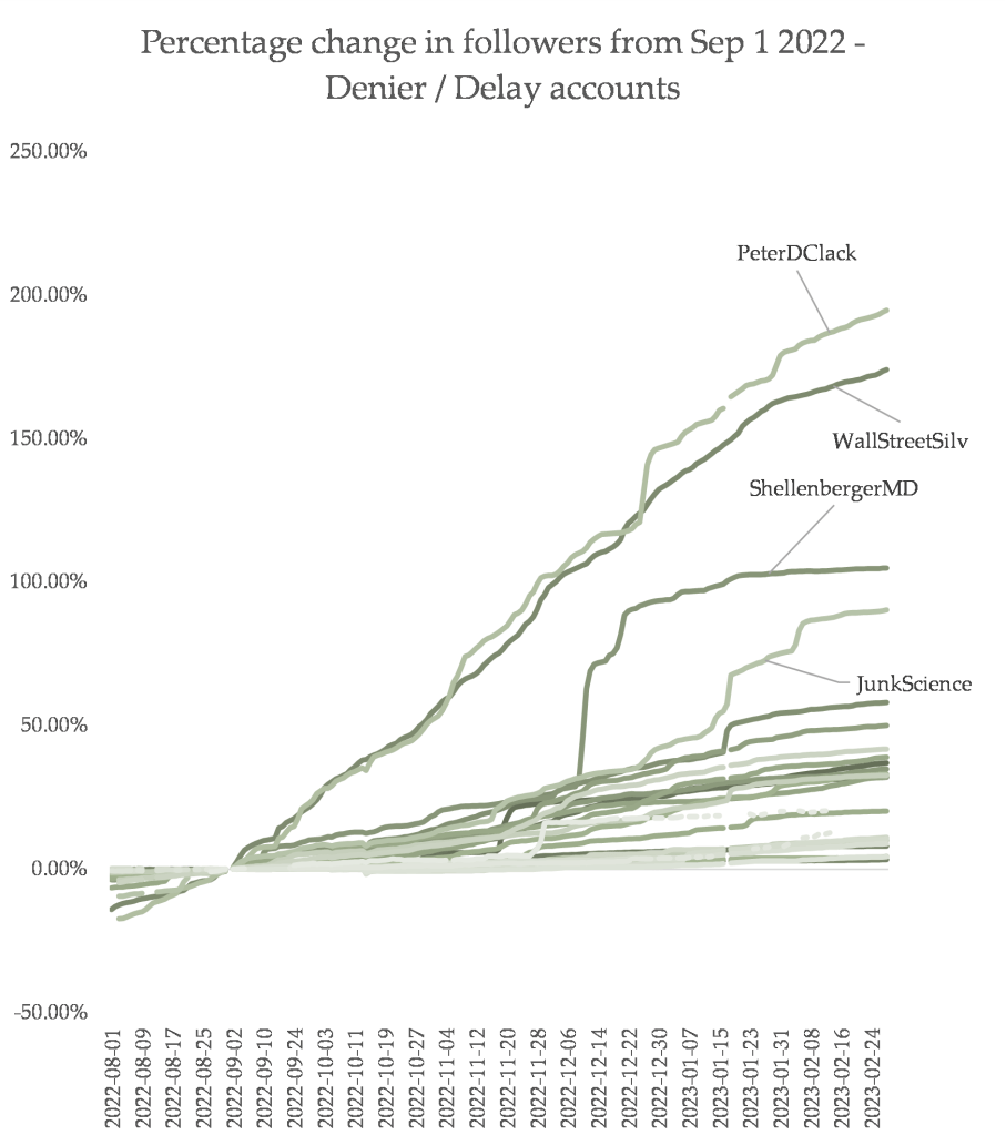 Travis Brown has a system that collections information about Twitter accounts over time, including follower count. It’s weighted towards collecting information on conservative / right-wing networks, but out of curiosity, I messaged him to see if he could help answer a question I was pondering: are climate deniers seeing a significant increase in their Twitter platform, compared to pro-climate accounts?