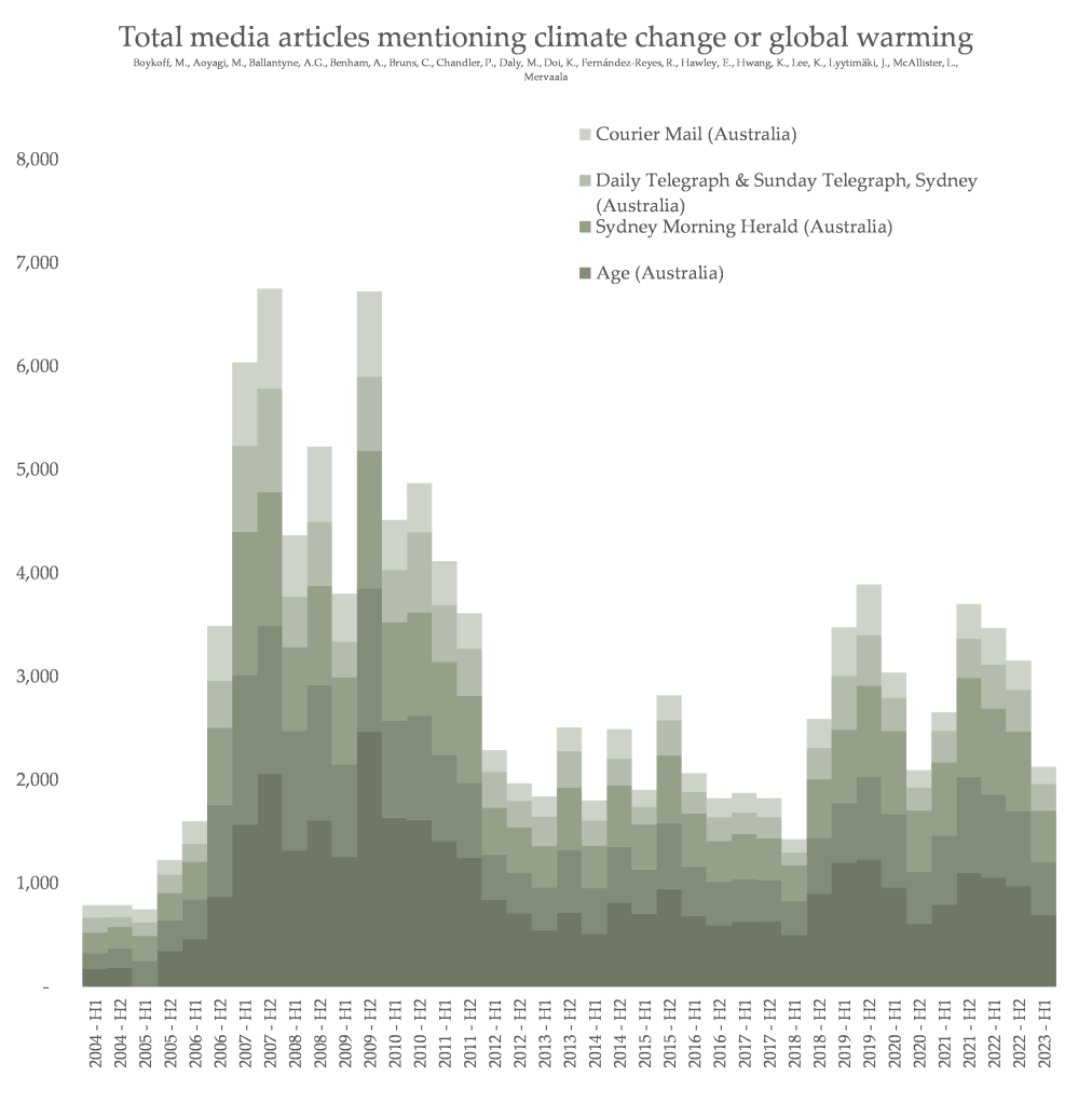 It isn’t that there’s a lack of climate reporting. The MeCCo database only covers a few print media outlets, and showcases many thousands of articles on climate over the past few decades (115,508 between 2004 and 2023, to be exact):