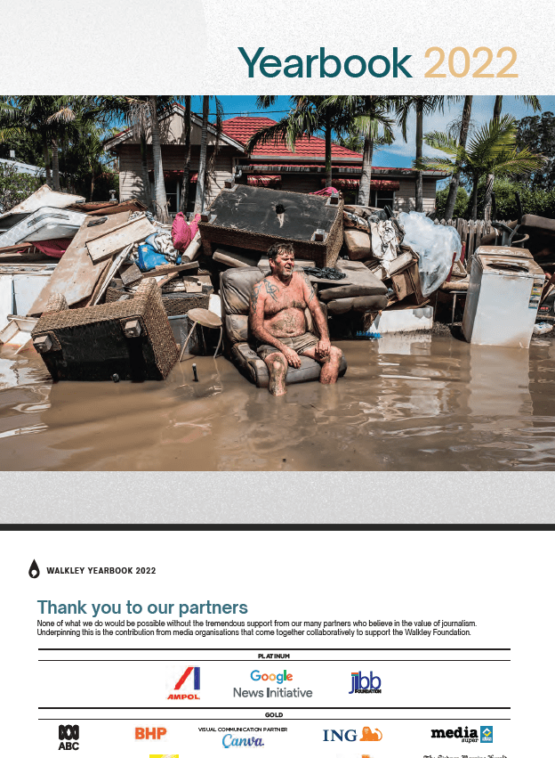 Even more spectacularly, the 2022 “yearbook” from the Walkleys shows an award-winning photo of flood-hit Lismore directly above a big, proud flashy logo for Ampol:
