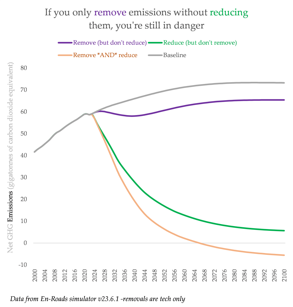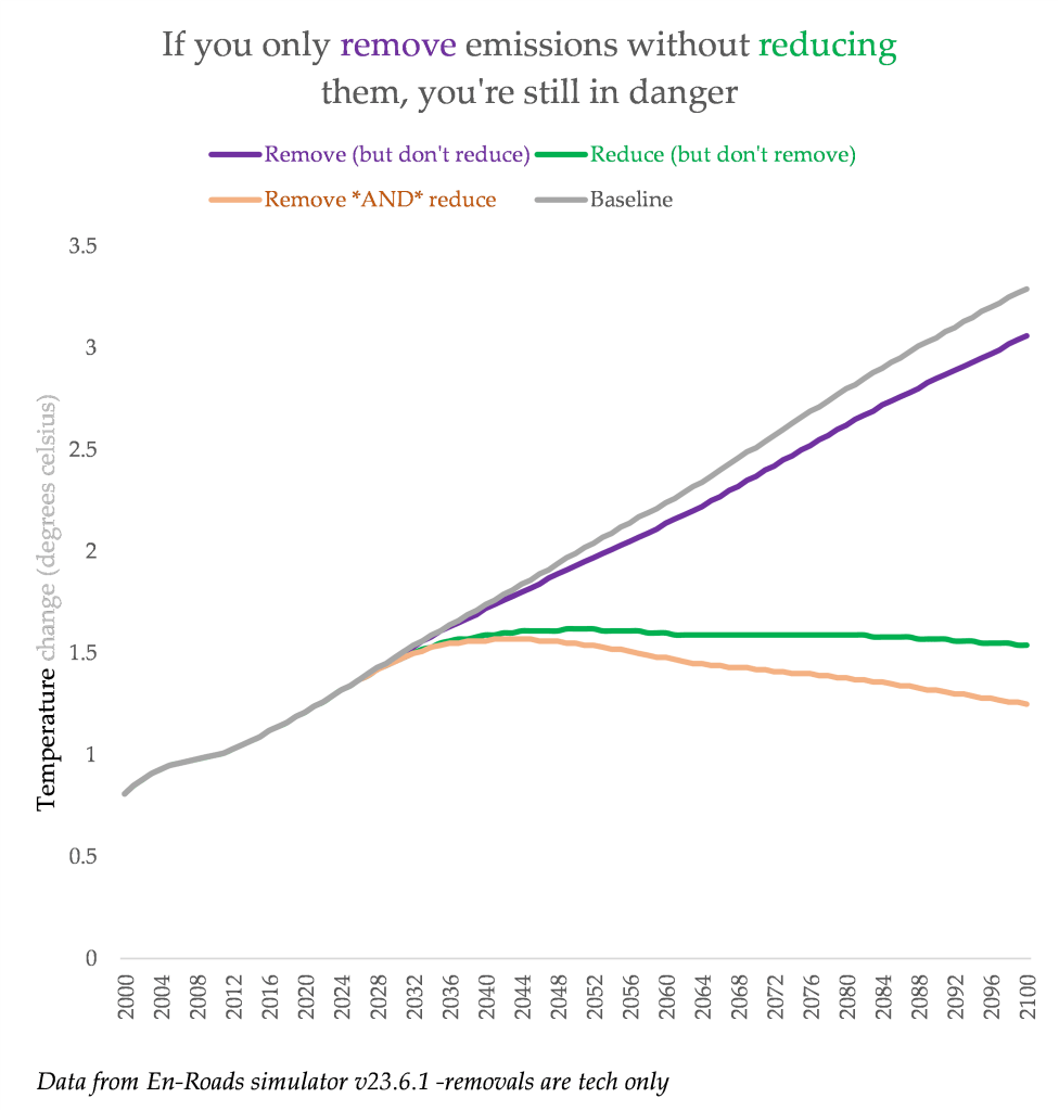 To put it simply: it is fundamentally impossible to just continue growing emissions as per normal, and remove it afterwards. There is a cool model called ‘En-Roads’ that lets you turn knobs on a climate model simulation, and I’ve used it to create an illustration of an important point.