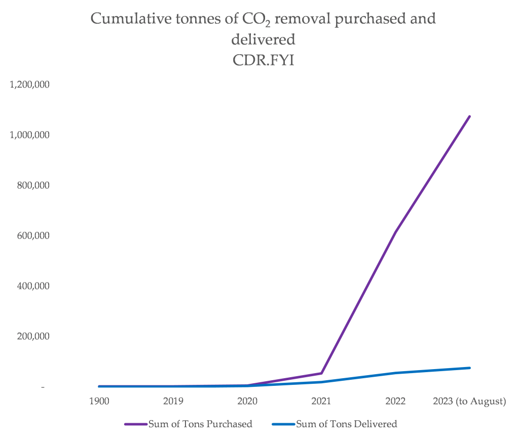 There is a massive pre-purchasing frenzy happening right now. In 2020, about 70% of the removals purchased were delivered. In 2023, to date, 7% of removals purchased have been delivered (almost entirely from ‘biochar’, which is superheating trees so they turn to solid carbon without combusting them as fuel – think that shiny black stuff on the pizza you burned in the oven).