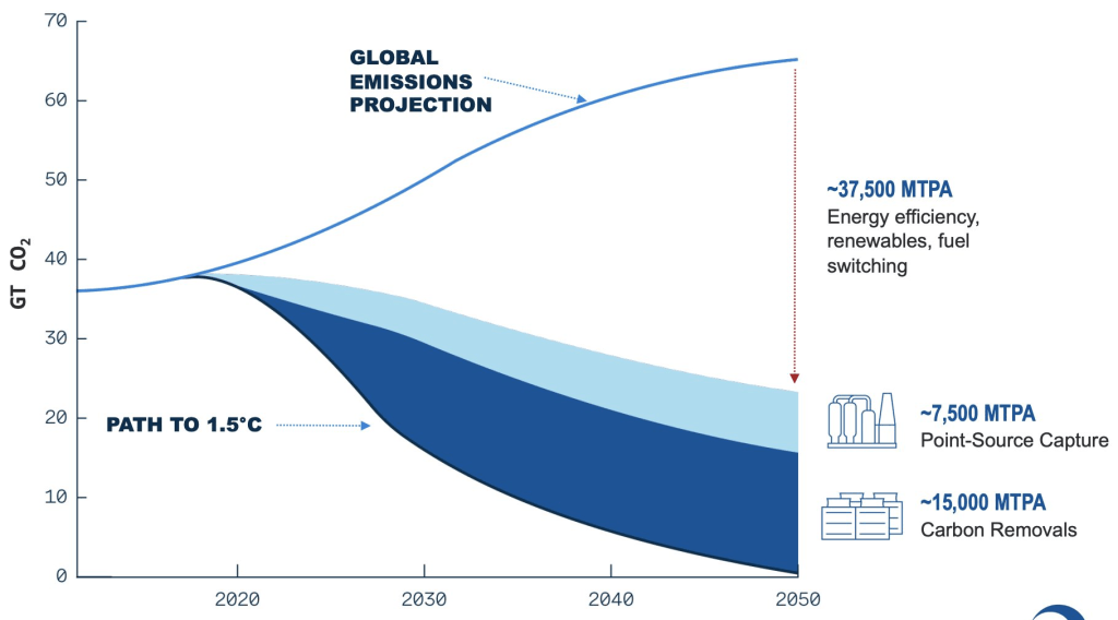 Occidental Petroleum are a large oil and gas company based in Texas, USA. Their investor deck lays out their vision of carbon removal – one which we do far less mitigation and far more removals than the maxed-out modelling above. In their view, emissions in 2050 remain around two thirds of what they are today, and carbon removal is a few times larger than what most reasonable models max out at.