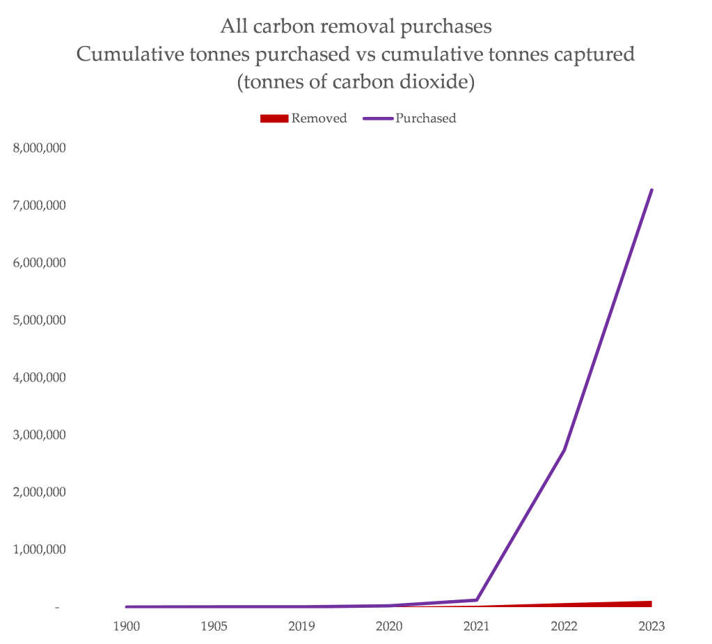 This is obviously set to worsen. There is a huge flurry of “pre-purchasing” of carbon removal, and very little delivery. You could see this as a valuable flow of early-stage funding, but considering major companies are seemingly claiming these pre-purchases as completed removals, despite the possibility that these may never happen, it’s a growing bubble that is going to burst dramatically if nothing is done.
