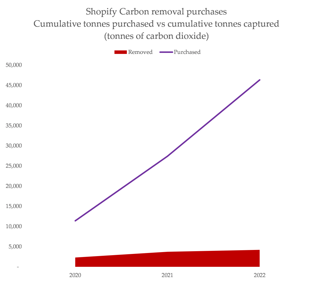 Here’s another problem: from 2020 to 2022, shopify claims around 31,000 tonnes of carbon removal. But according to the CDR.FYI database, only 4,000 of the tonnes they have purchased have been actually physically removed from the atmosphere: