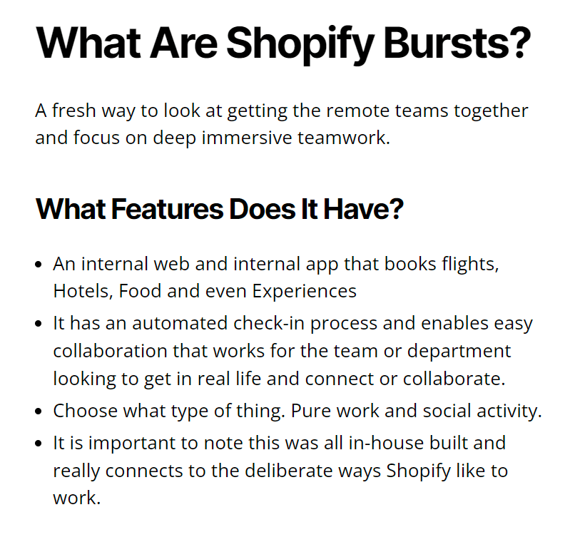 This Business Insider article details the fact that these Burst trips were often a mix of leisure and work. “Some were held at luxury hotels like The Ranch at Laguna Beach in California or the Fairmont Jasper Park Lodge in Alberta, Canada…Other burst sites included locations in Germany and Las Vegas, and a French château, employees said. A video about bursts posted to LinkedIn by Shopify showcases ports in San Francisco, Toronto, and Berlin”.