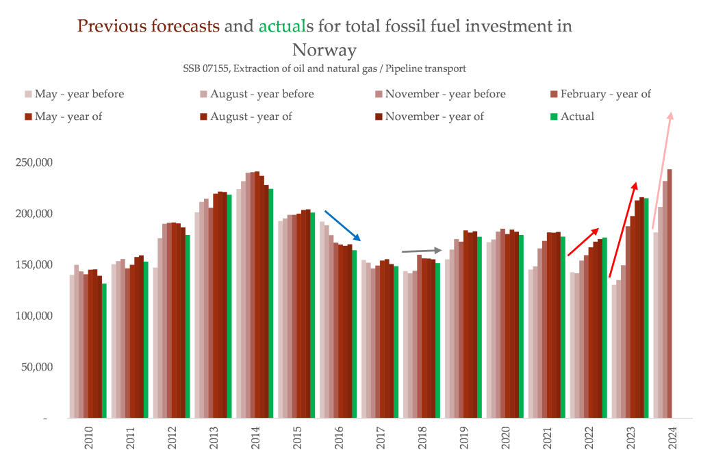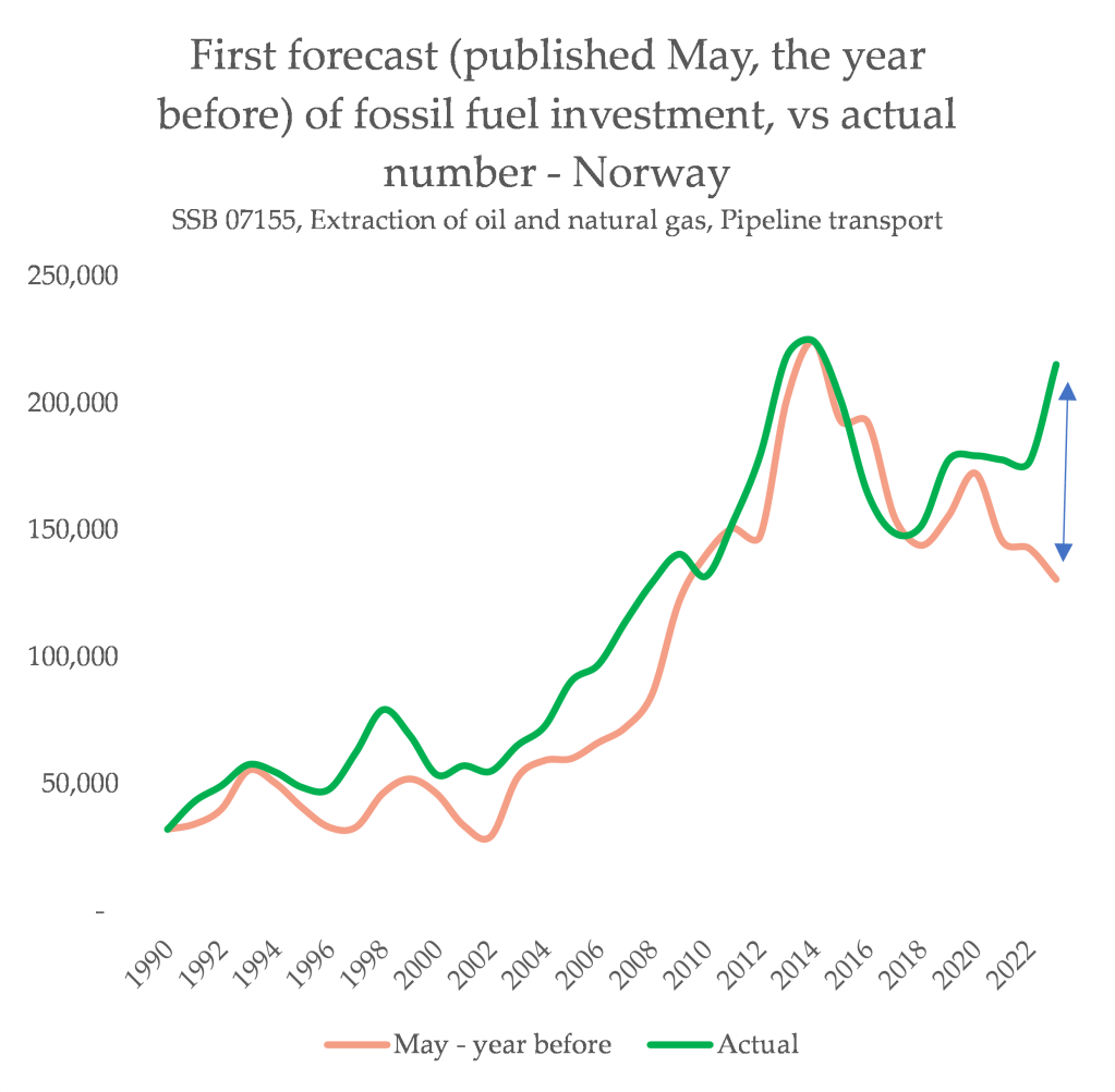 What we see now is a wild underestimate of how much cash ends up being spent on trying to get more fossil fuels out of the ground. In 2023 for instance, the first projection for that year (published in May 2022) was 130,000 million NOK. It ended up at 215,000 million NOK – 60% higher.