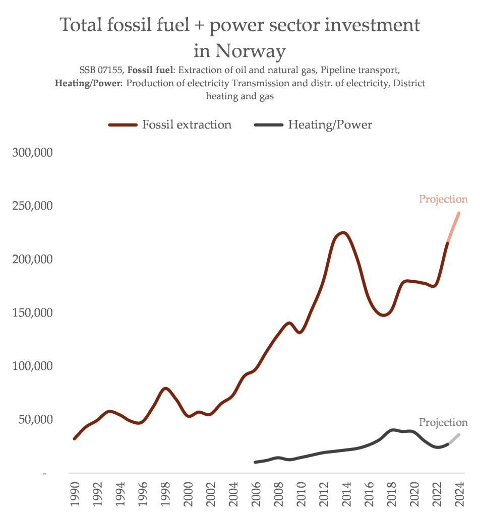 The projections for 2024 are already suggesting Norway will spend more than it has ever spent on new fossil fuel supply – and given the past few years, even this is probably an underestimate. Compare this to how spending in the power sector and heating have stagnated (a serious problem given our need to electrify transporting, heating and industry):