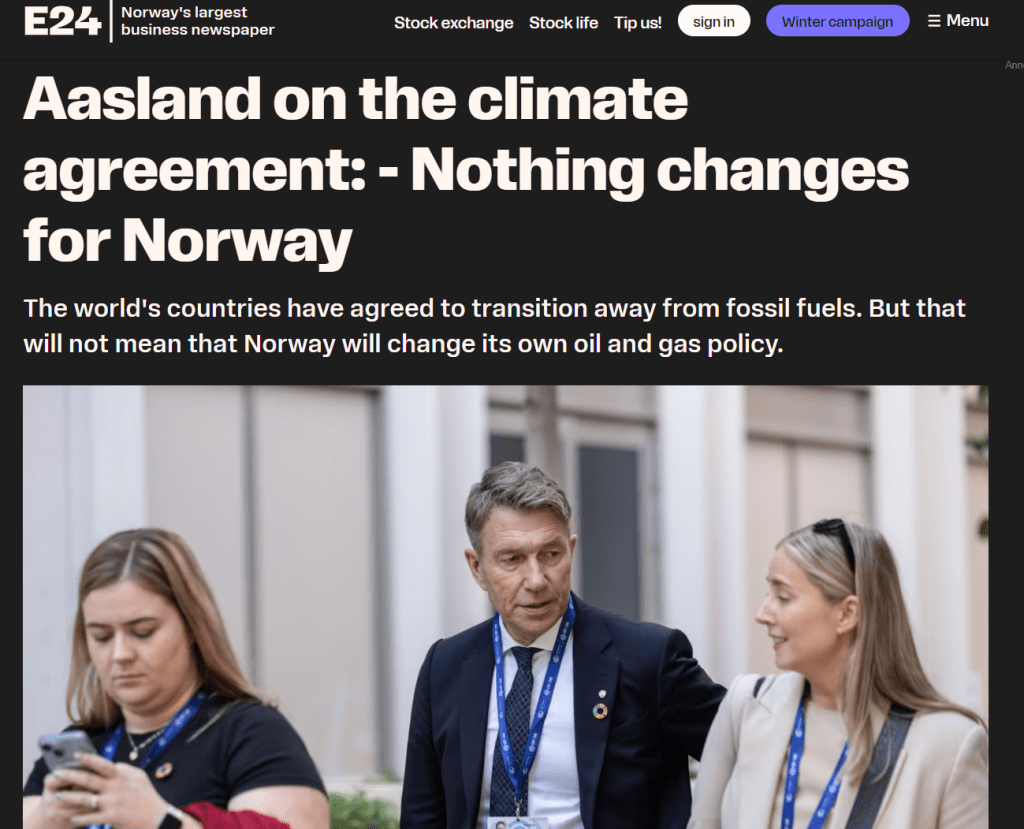 Norway’s government strutted away from COP28 whistling happily, high-fiving other ministers from similarly triumphant fossil exporting nations. The meeting ended with a call to ‘transition away’ from fossil fuels: something that’s never featured in a COP agreement before. Hell yes! Victory lap!