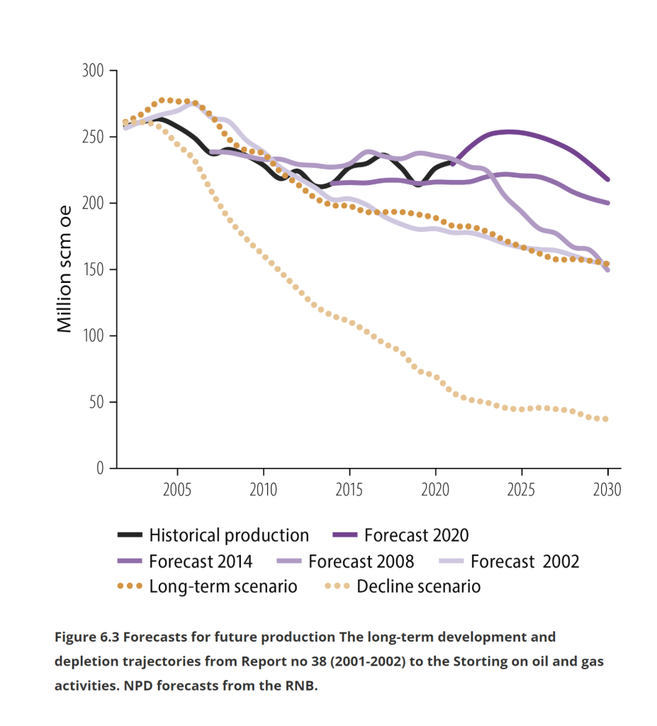 Norway’s government currently projects a fall in the amount of oil and gas we produce. That’s heralded as evidence of our transition responsibility, but it has been wrong before: Glen Peters from Norwegian climate research group CICERO highlights that we have a history of forecasting drops in fossil fuel production, while the reality remains a constantly flow of planet-heating products sold to the world. “The forecasts made have so far all been wrong! Production has not declined as the petroleum agency has predicted”, Glen said.