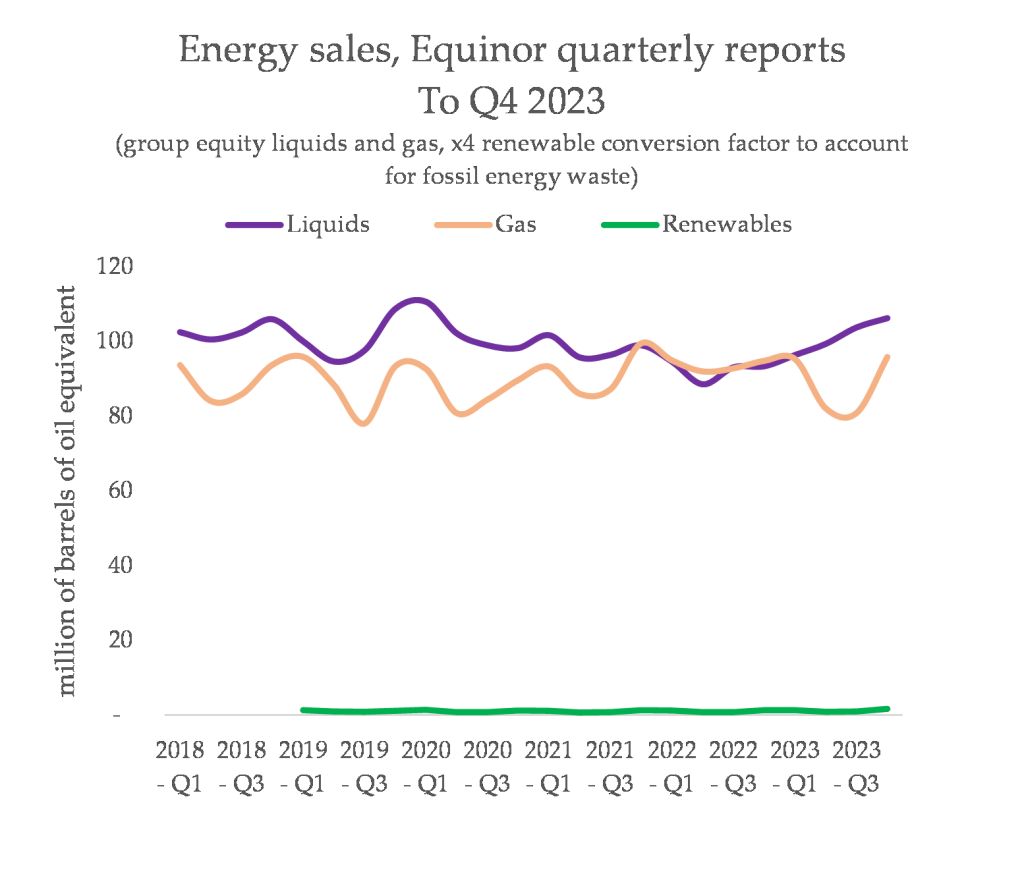 Norway’s somewhat-state-owned oil and gas company, Equinor, still finds worth in pretending to be in a state of transition away from selling fossil fuels and towards selling clean energy. But they do not walk their talk. Here’s the latest data on what they sell: