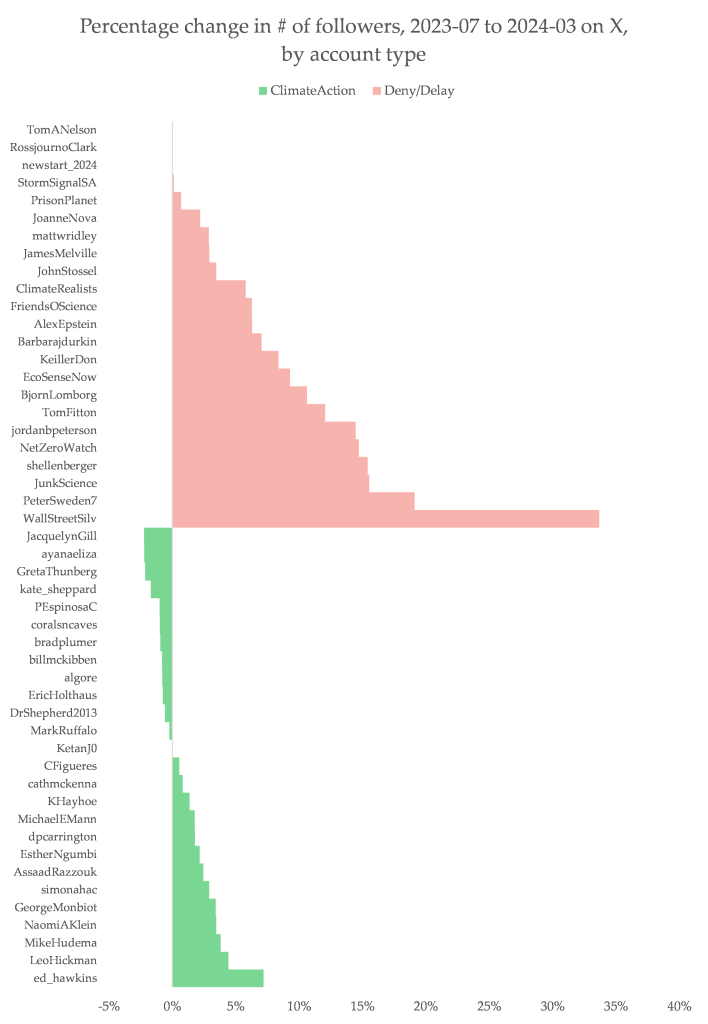 The results tell a similar story: climate deniers and delayers have seen their accounts grow materially since July last year; far greater than accounts supporting climate action, who have either lost followers or grown very little.