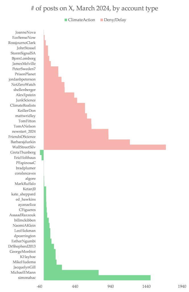 We can also see a snapshot of posting activity, and it shows that the denier/delayer group is far more active (though a few pro-climate-action accounts remain relatively active in this small sample):