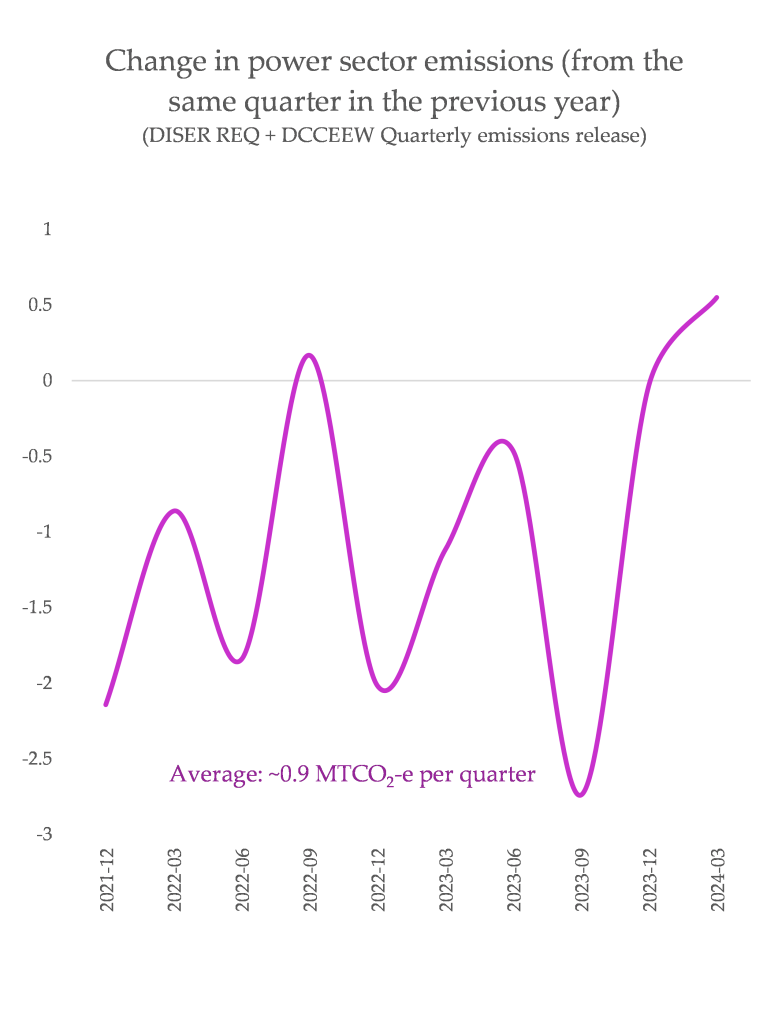 Australia’s average emissions reductions for the power sector during Albanese’s time as PM have been about 0.9 MTCO2-e: