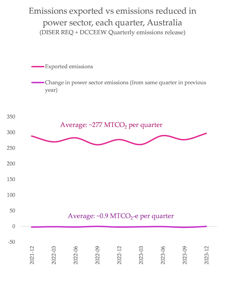 To put this in context: the average emissions from fossil fuels exported each quarter are about 275 MTCO2-e. Not only is the Albanese government’s renewable energy growth not offsetting fossil exports, the fossil export industry does about 300 times more climate damage than domestic renewables avoid:
