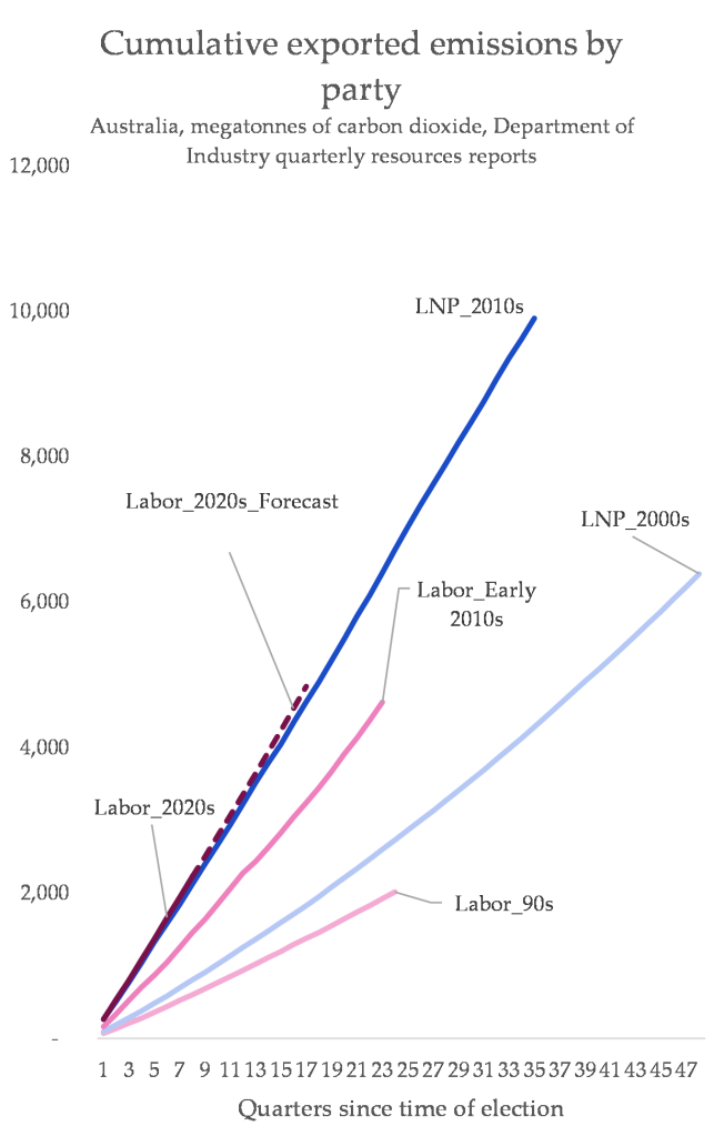 - These are numbers from the latest ‘Resources and Energy Quarterly report’, which I’ve depicted as the cumulative amount of fossil fuels exported by each government since they were elected, and have shown in terms of the amount of climate damage they will do (using a sort of clumsy conversion factors – 2.56 for coal and 2.75 for gas – both numbers very significantly underestimate the real emissions impact of sending fossil fuels overseas, for eg, gas gets leaked out of pipelines and out of tankers ). ↩︎