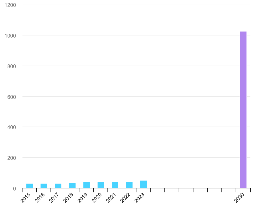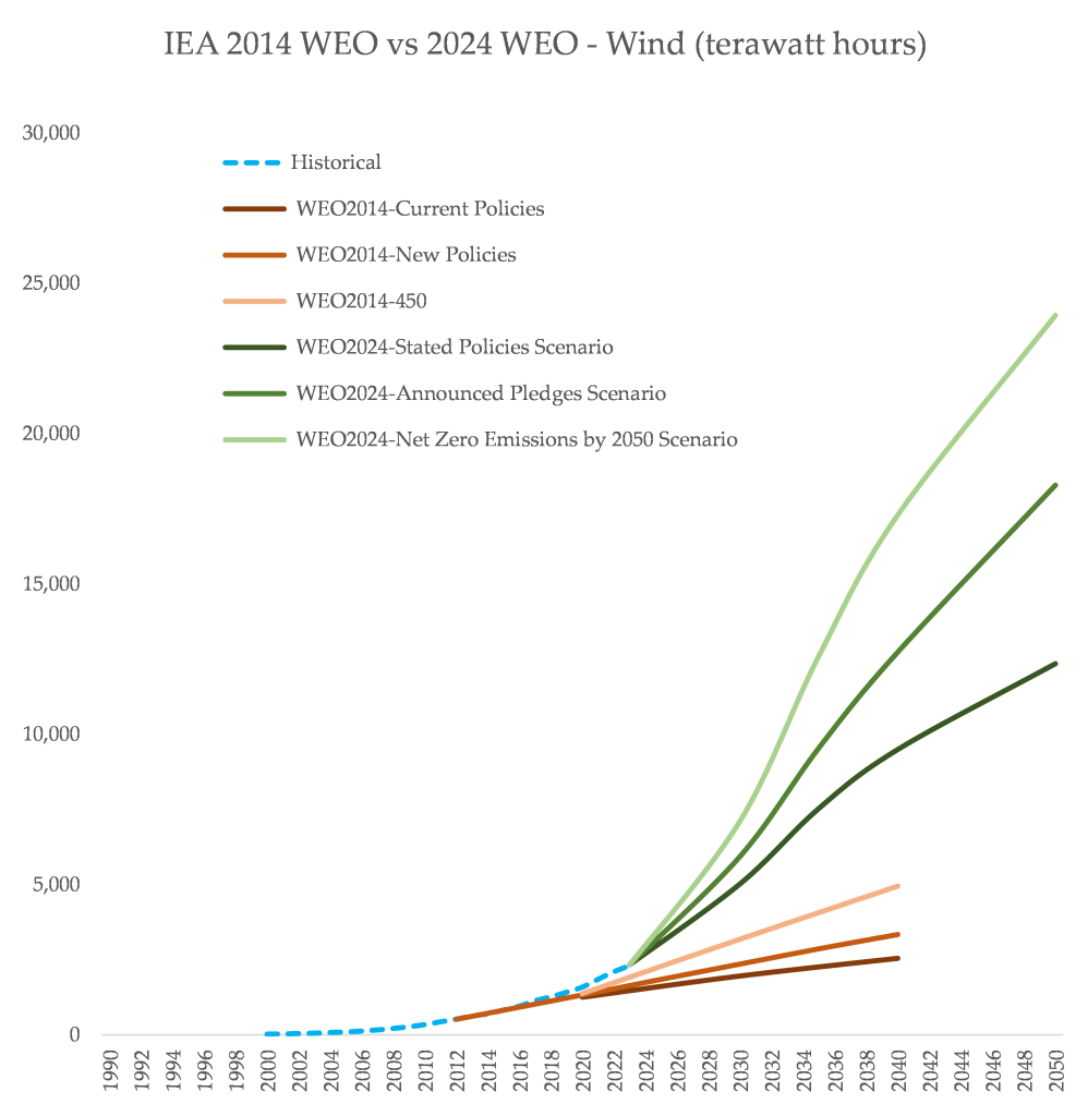 To continue the comparison with wind and solar, these two technologies exhibit the exact opposite effect: the IEA’s scenarios have historically underestimated the deployment of the technologies (across all their scenarios). The two graphics below4 compare the 2014 ‘World Energy Outlook’ scenarios, and their assumptions on wind and solar power generation, to the 2024 edition’s projections, overlaid with what both actually generated each year: