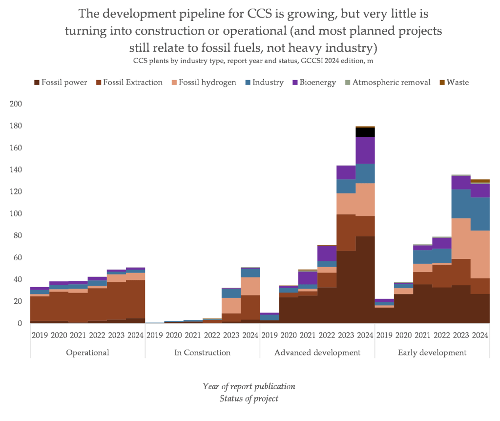 As with so many previous years, the change in ‘operational’ CCS is small. The pipeline for CCS has been surging for a half-decade now, and the amount of operational CCS has only grown by a few megatonnes of capacity. We were promised a CCS revolution, and we aren’t getting one.