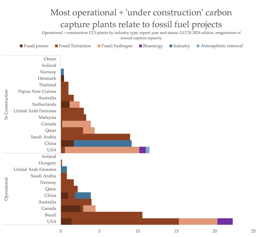 The rise in operational CCS between 2023 and 2024 comes largely from the reactivation of the CCS attachment to the Petra Nova coal plant: previously, the captured carbon was being used to dislodge more oil, and the rising oil price means it’s now profitable again to run that CCS. Very grim.
