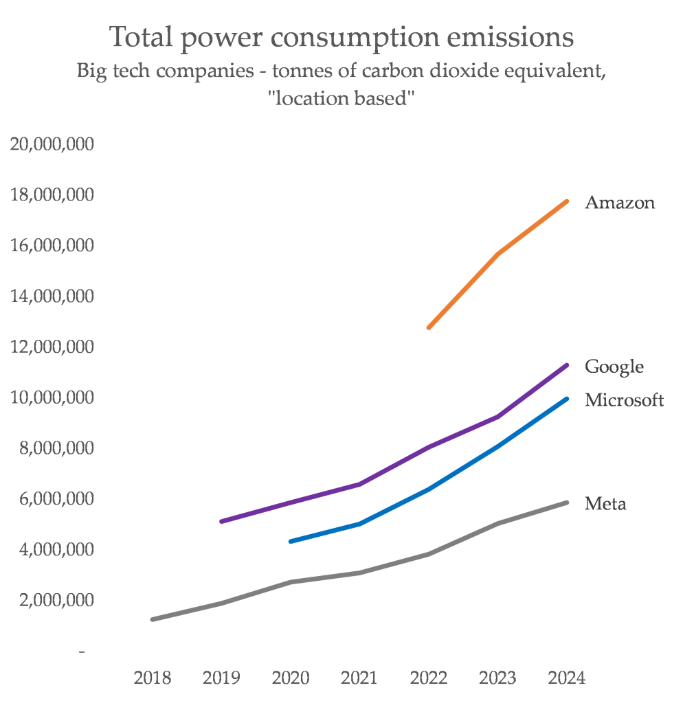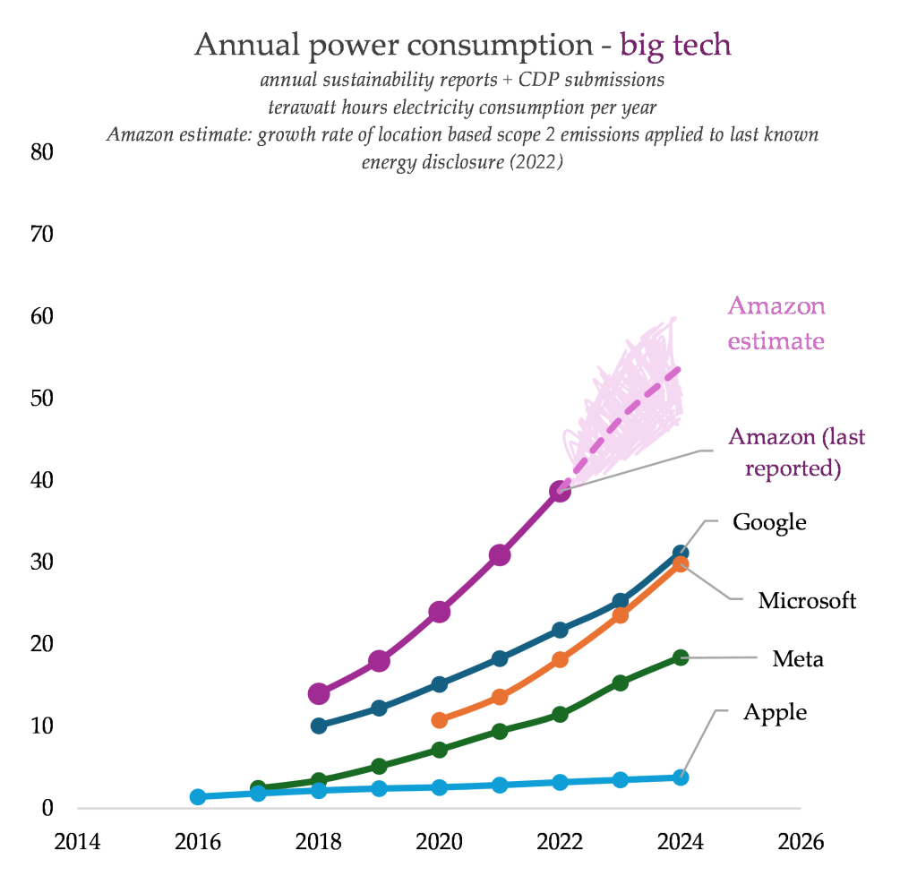 As you know, big tech is facing rising scrutiny for their rising energy consumption, and their rising climate impacts. This collection doesn’t just gather their disclosures: I try to reverse-engineer the adjustments big tech companies are making to their emissions data, to get a clearer picture of their real climate impacts. Sometimes they use carbon offsets, sometimes they use suspect renewable energy certificates – and you end up with headline emissions numbers way lower than ‘unadjusted’, or ‘raw’, figures.