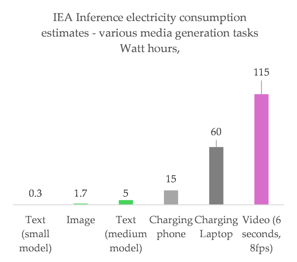 Text generation by a chatbot is comfortably the lowest energy form of generative system. In the International Energy Agency (IEA)’s recent report into energy and “AI”, they came up with an estimate of the energy impact of different types of generation that nicely shows the differences:3