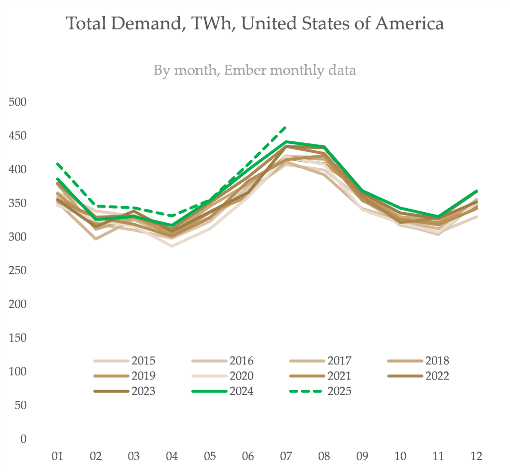 For the past 16 months, power demand in the US has been at a record high (for that same month every year prior). 2025’s peak emissions were higher than the peaks of the past four years. This is systemic, not seasonal: America’s data centre soaked grid has begun properly backsliding.