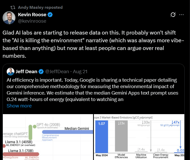 A few experts welcomed Google’s report, but cautioned politely that the company might not be painting the full picture. A more common reception has been wise nodding from those who always knew that generative AI was environmentally benign. A nice example is the New York Times’ tech columnist Kevin Roose, who said this: