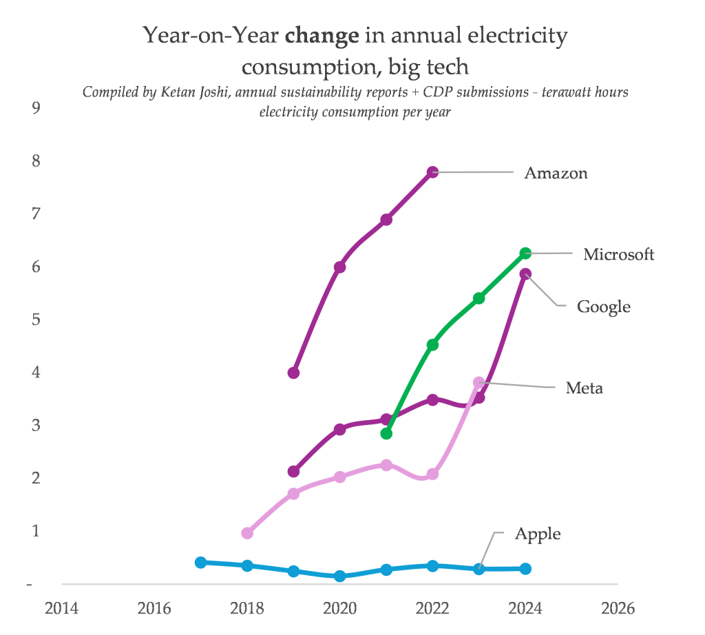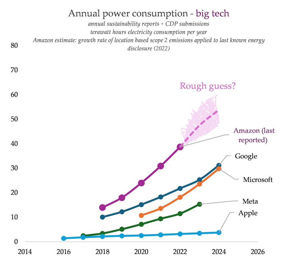 As you probably guessed, or maybe knew already, Google, like Microsoft and Meta, has blown wildly past its climate targets thanks to a combination of skyrocketing direct energy consumption and the climate impact of speed-building new data centres. The two images below, from my compilation of big tech energy disclosures, show two different things.