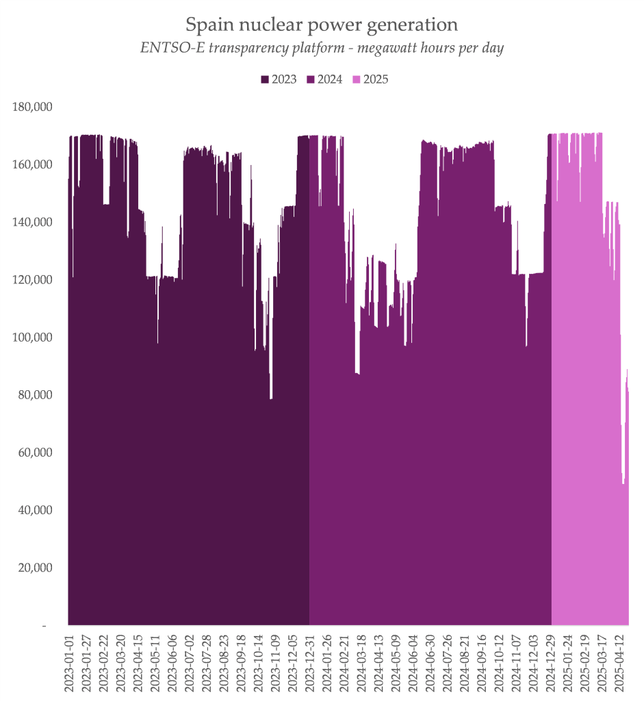 To give you an idea of how weird nuclear power output was, here’s the country’s daily nuclear generation from the start of 2023 to April 27th, the day before the blackout. You can see the dip down low on the far right of the image: