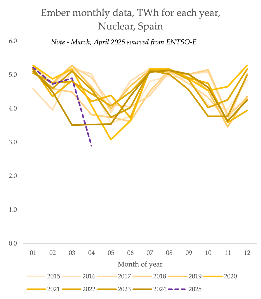 Looking deep into this data flips the script. The story told in media is that Spain was suffering from ‘too much solar’. Who has been asking why half of Spain’s nuclear fleet was taken offline at the time of the grid instability?