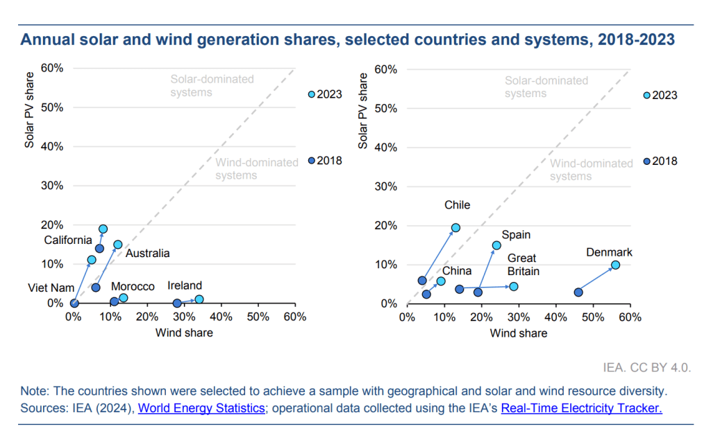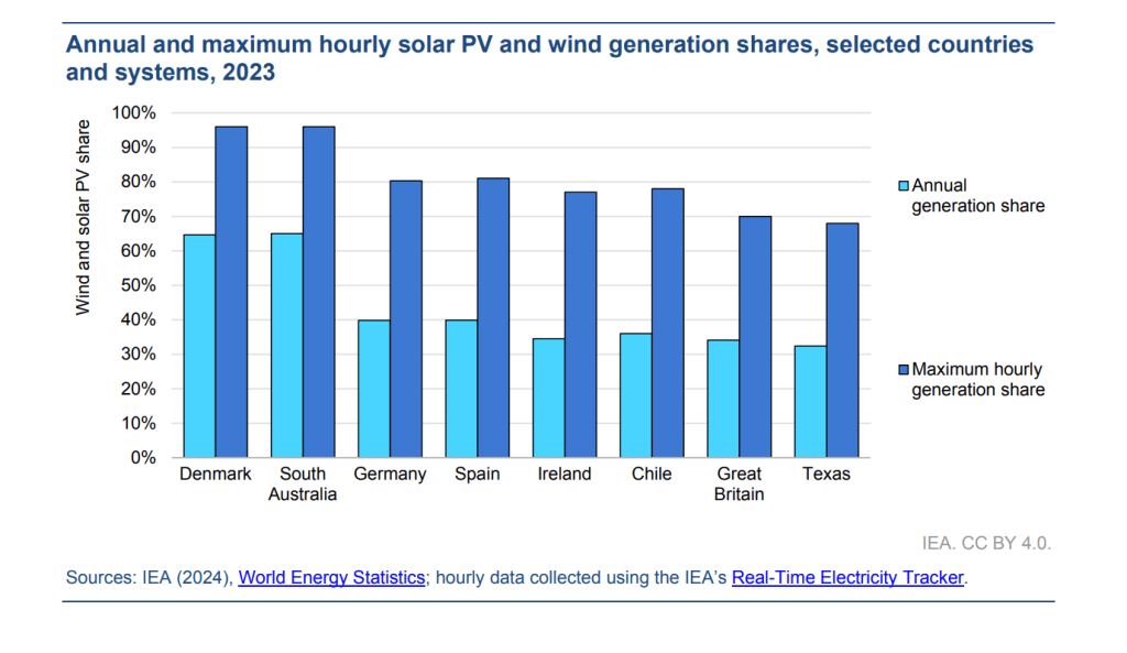 It is also worth noting that in the same way wind and solar generation were not abnormally high on April 28th, the Iberian Peninsula is not abnormal when it comes to high shares of variable renewable energy. This September 2024 IEA report lays out, very clearly, that other regions like the UK, Germany, Denmark, Chile, Ireland, Australia, Kyushu (Japan), Texas and California all manage varying levels of wind and solar, with varying degrees of interconnection into other regions – each with their own suite of challenges, too.