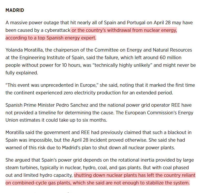 “[A week after a debate on the future on nuclear in early April], Almaraz temporarily shut down the two units citing abundant wind energy supply as making operations uneconomic. One unit was still offline on Monday [the 28th, the day of the blackout]”